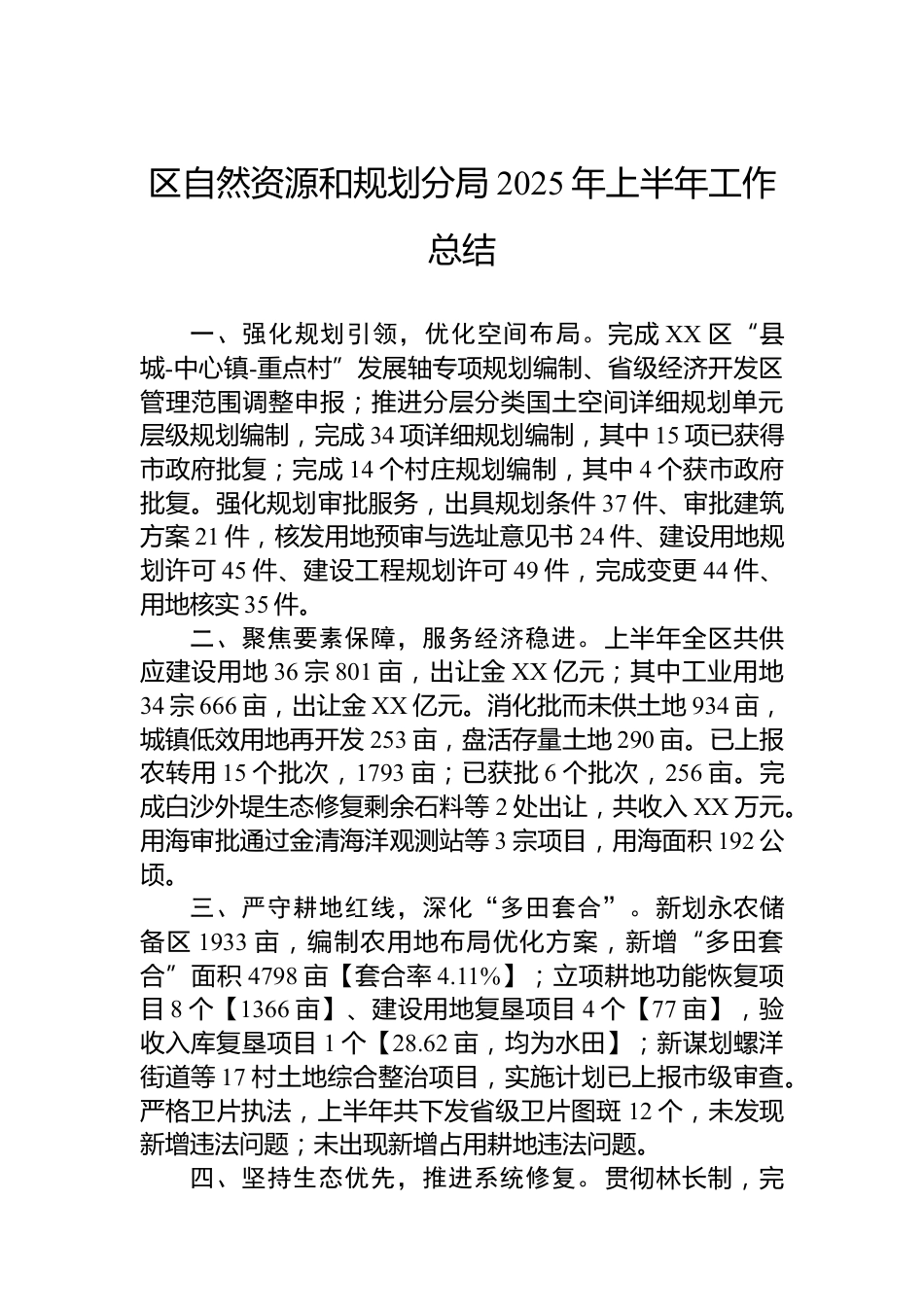 區(qū)自然資源和規(guī)劃分局2025年上半年工作總結(jié)一、強化規(guī)劃引領(lǐng),優(yōu)化空間布局。完成XX區(qū)“縣城-中心鎮(zhèn)-重點村”發(fā)展軸專項規(guī)劃編制、省級經(jīng)濟開發(fā)區(qū)管理范圍調(diào)整申報;推進(jìn)分層分類國土空間詳細(xì)規(guī)劃單元層級規(guī)劃編制,完成34項詳細(xì)規(guī)劃編制,其中15項已獲得市政府批復(fù);完成14個村莊規(guī)劃編制,其中4個獲市政府批復(fù)。強化規(guī)劃審批服務(wù),出具規(guī)劃條件37件、審批建筑方案21件,核發(fā)用地預(yù)審與選址意見書24件、建設(shè)用地規(guī)劃許可45件、建設(shè)工程規(guī)劃許可49件,完成變更44件、用地核實35件。二、聚焦要素保障,服務(wù)經(jīng)濟穩(wěn)進(jìn)。上半年全區(qū)共供應(yīng)建設(shè)用地36宗801畝,出讓金XX億元;其...