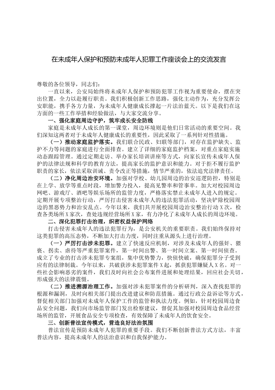 在未成年人保護和預(yù)防未成年人犯罪工作座談會上的交流發(fā)言尊敬的各位領(lǐng)導(dǎo),同志們:一直以來,公安局始終將未成年人保護和預(yù)防犯罪工作視為重要使命,擺在突出位置,全力以赴履行職責(zé)。我們積極創(chuàng)新工作思路,強化主動作為,充分發(fā)揮公安職能,攜手各方力量,為未成年人健康成長撐起一片法治藍天。以下是我們在這方面的一些工作舉措和經(jīng)驗做法,與大家交流分享。一、強化家庭周邊守護,筑牢成長安全防線家庭是未成年人成長的第一課堂,周邊環(huán)境則是他們?nèi)粘;顒拥闹匾臻g。我們深知這兩者對于未成年人健康成長的重要性,因此采取了一系列針對性措施。(一)推動家庭監(jiān)護...