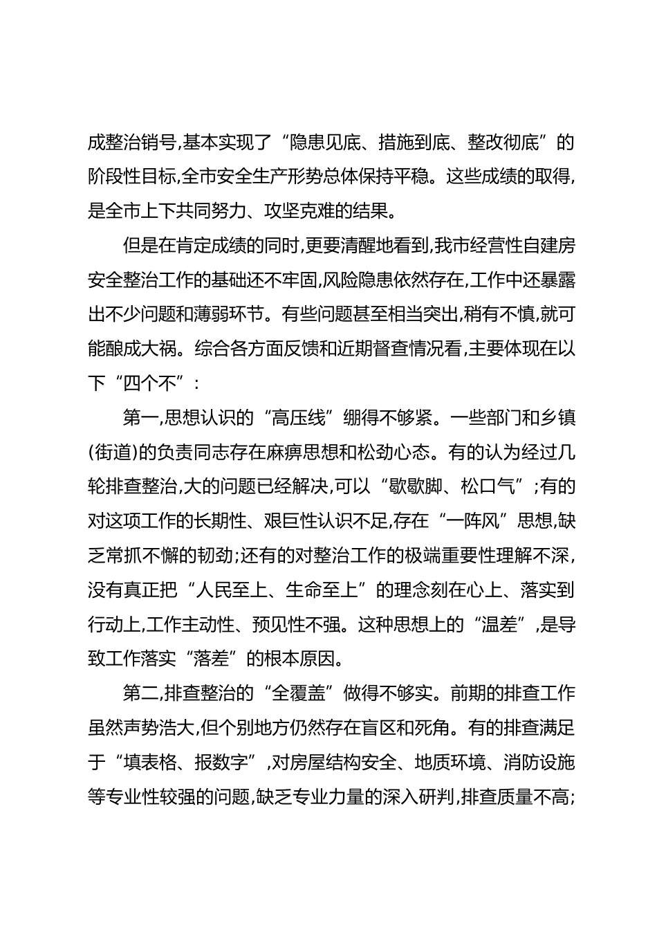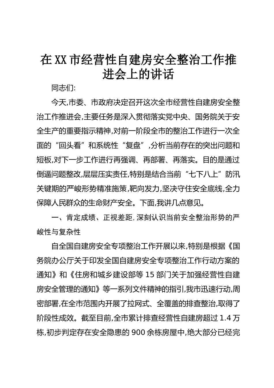 在XX市經(jīng)營性自建房安全整治工作推進(jìn)會(huì)上的講話同志們:今天,市委、市政府決定召開這次全市經(jīng)營性自建房安全整治工作推進(jìn)會(huì),主要任務(wù)是深入貫徹落實(shí)黨中央、國務(wù)院關(guān)于安全生產(chǎn)的重要指示精神,對(duì)前一階段全市的整治工作進(jìn)行一次全面的“回頭看”和系統(tǒng)性“復(fù)盤”,分析當(dāng)前存在的突出問題和短板,對(duì)下一步工作進(jìn)行再強(qiáng)調(diào)、再部署、再落實(shí)。目的是通過倒逼問題整改,層層壓實(shí)責(zé)任,特別是結(jié)合當(dāng)前“七下八上”防汛關(guān)鍵期的嚴(yán)峻形勢精準(zhǔn)施策,靶向發(fā)力,堅(jiān)決守住安全底線,全力保障人民群眾的生命財(cái)產(chǎn)安全。下面,我講幾點(diǎn)意見。一、肯定成績、正視差距,深刻認(rèn)識(shí)當(dāng)前安全整治形勢的...