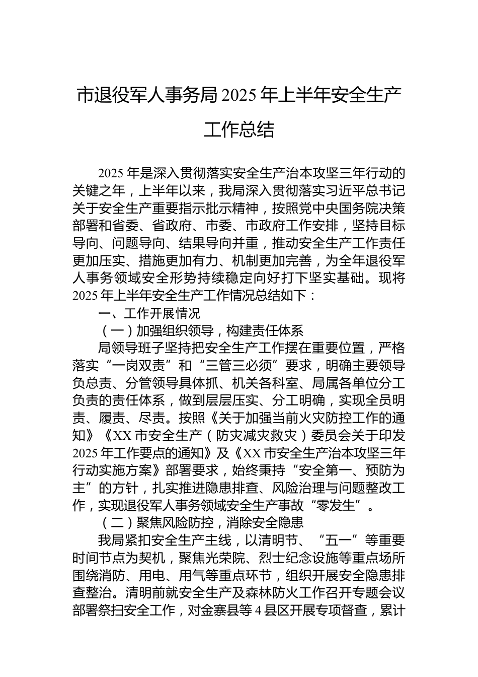 市退役軍人事務局2025年上半年安全生產工作總結2025年是深入貫徹落實安全生產治本攻堅三年行動的關鍵之年,上半年以來,我局深入貫徹落實習近平總書記關于安全生產重要指示批示精神,按照黨中央國務院決策部署和省委、省政府、市委、市政府工作安排,堅持目標導向、問題導向、結果導向并重,推動安全生產工作責任更加壓實、措施更加有力、機制更加完善,為全年退役軍人事務領域安全形勢持續(xù)穩(wěn)定向好打下堅實基礎?,F(xiàn)將2025年上半年安全生產工作情況總結如下:一、工作開展情況(一)加強組織領導,構建責任體系局領導班子堅持把安全生產工作擺在重要位置,嚴格落實“一崗...