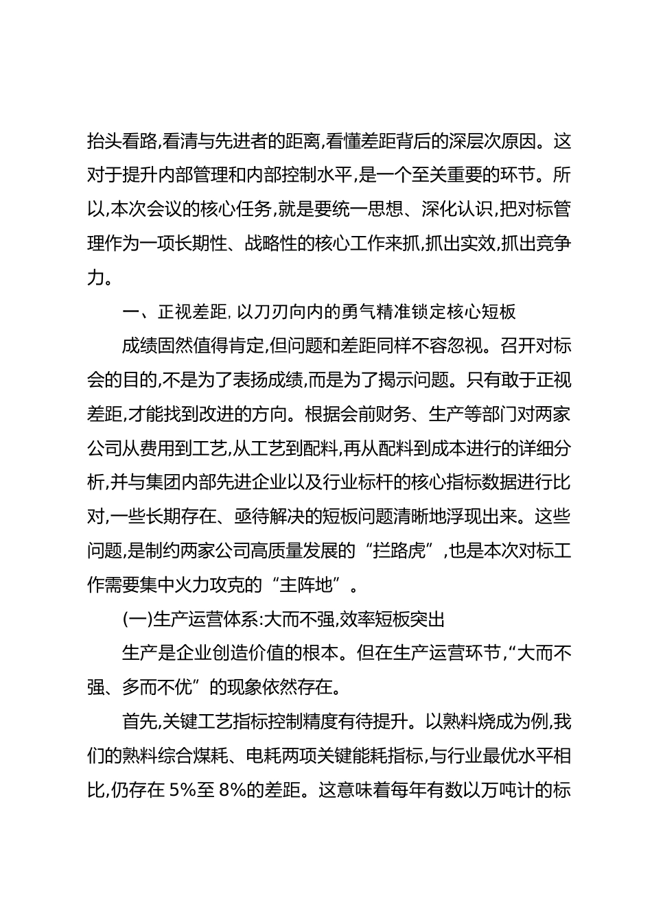 在XX公司生產(chǎn)經(jīng)營對標(biāo)專題會議上的講話同志們:今天,集團(tuán)將XX公司和XX公司兩家單位的負(fù)責(zé)同志、業(yè)務(wù)骨干召集在一起,召開這次生產(chǎn)經(jīng)營對標(biāo)專題會議。這次會議,既是一次數(shù)據(jù)詳實的分析會,更是一次直面問題的診斷會,也是一次明確方向、加壓奮進(jìn)的動員會。召開此次會議的目的十分明確,就是要通過系統(tǒng)性、全方位地對標(biāo)行業(yè)先進(jìn)和內(nèi)部標(biāo)桿,利用對標(biāo)發(fā)現(xiàn)短板,通過分析研究解決辦法,最終要補(bǔ)齊短板,向先進(jìn)指標(biāo)看齊,推動兩家公司乃至整個集團(tuán)的管理水平實現(xiàn)質(zhì)的飛躍。當(dāng)前,市場環(huán)境正在發(fā)生深刻而復(fù)雜的變化,行業(yè)競爭的激烈程度前所未有,技術(shù)迭代與產(chǎn)業(yè)升級的浪潮洶涌而至。身處這...