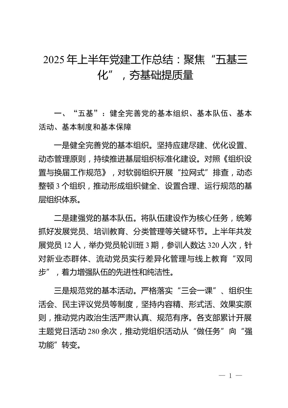 2025年上半年黨建工作總結(jié):聚焦“五基三化”,夯基礎(chǔ)提質(zhì)量一、“五基”:健全完善黨的基本組織、基本隊(duì)伍、基本活動(dòng)、基本制度和基本保障一是健全完善黨的基本組織。堅(jiān)持應(yīng)建盡建、優(yōu)化設(shè)置、動(dòng)態(tài)管理原則,持續(xù)推進(jìn)基層組織標(biāo)準(zhǔn)化建設(shè)。對(duì)照《組織設(shè)置與換屆工作規(guī)范》,對(duì)軟弱組織開(kāi)展“拉網(wǎng)式”排查,動(dòng)態(tài)整頓3個(gè)組織,推動(dòng)形成組織健全、設(shè)置合理、運(yùn)行規(guī)范的基層組織體系。二是建強(qiáng)黨的基本隊(duì)伍。將隊(duì)伍建設(shè)作為核心任務(wù),統(tǒng)籌抓好發(fā)展黨員、培訓(xùn)教育、分類(lèi)管理等關(guān)鍵環(huán)節(jié)。上半年共發(fā)展黨員12人,舉辦黨員輪訓(xùn)班3期,參訓(xùn)人數(shù)達(dá)320人次,針對(duì)新業(yè)態(tài)群體、流動(dòng)黨...
