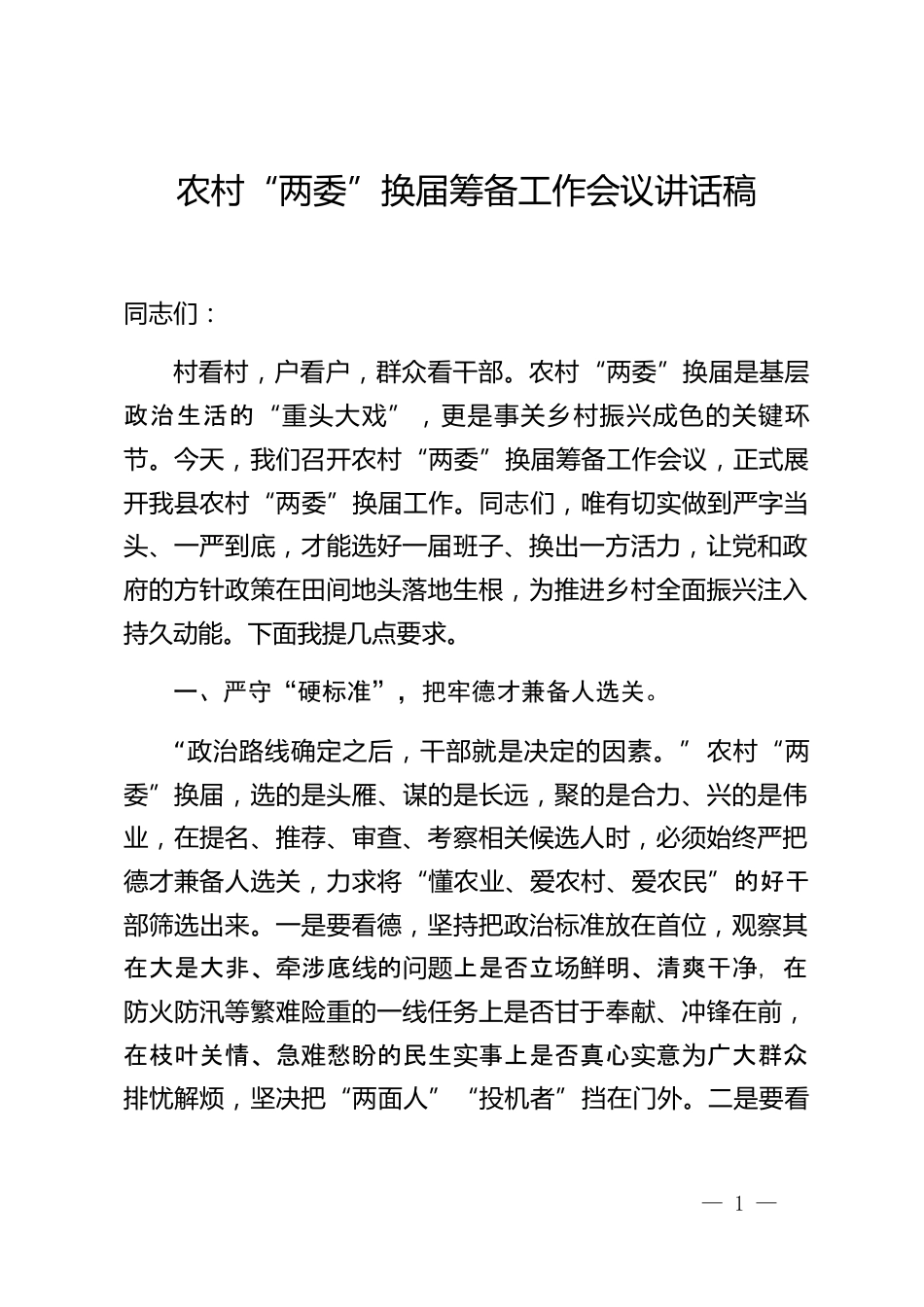 農(nóng)村“兩委”換屆籌備工作會(huì)議講話稿同志們:村看村,戶看戶,群眾看干部。農(nóng)村“兩委”換屆是基層政治生活的“重頭大戲”,更是事關(guān)鄉(xiāng)村振興成色的關(guān)鍵環(huán)節(jié)。今天,我們召開農(nóng)村“兩委”換屆籌備工作會(huì)議,正式展開我縣農(nóng)村“兩委”換屆工作。同志們,唯有切實(shí)做到嚴(yán)字當(dāng)頭、一嚴(yán)到底,才能選好一屆班子、換出一方活力,讓黨和政府的方針政策在田間地頭落地生根,為推進(jìn)鄉(xiāng)村全面振興注入持久動(dòng)能。下面我提幾點(diǎn)要求。一、嚴(yán)守“硬標(biāo)準(zhǔn)”,把牢德才兼?zhèn)淙诉x關(guān)?!罢温肪€確定之后,干部就是決定的因素?!鞭r(nóng)村“兩委”換屆,選的是頭雁、謀的是長(zhǎng)遠(yuǎn),聚的是合力、興的是...