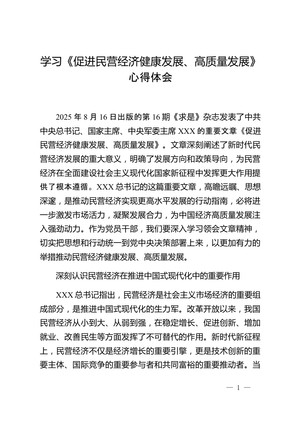 學(xué)習(xí)《促進(jìn)民營(yíng)經(jīng)濟(jì)健康發(fā)展、高質(zhì)量發(fā)展》心得體會(huì)2025年8月16日出版的第16期《求是》雜志發(fā)表了中共中央總書記、國(guó)家主席、中央軍委主席XXX的重要文章《促進(jìn)民營(yíng)經(jīng)濟(jì)健康發(fā)展、高質(zhì)量發(fā)展》。文章深刻闡述了新時(shí)代民營(yíng)經(jīng)濟(jì)發(fā)展的重大意義,明確了發(fā)展方向和政策導(dǎo)向,為民營(yíng)經(jīng)濟(jì)在全面建設(shè)社會(huì)主義現(xiàn)代化國(guó)家新征程中發(fā)揮更大作用提供了根本遵循。XXX總書記的這篇重要文章,高瞻遠(yuǎn)矚、思想深邃,是推動(dòng)民營(yíng)經(jīng)濟(jì)實(shí)現(xiàn)更高水平發(fā)展的行動(dòng)指南,必將進(jìn)一步激發(fā)市場(chǎng)活力,凝聚發(fā)展合力,為中國(guó)經(jīng)濟(jì)高質(zhì)量發(fā)展注入強(qiáng)勁動(dòng)力。作為黨員干部,我們要深入學(xué)習(xí)領(lǐng)會(huì)文章精神,切實(shí)...