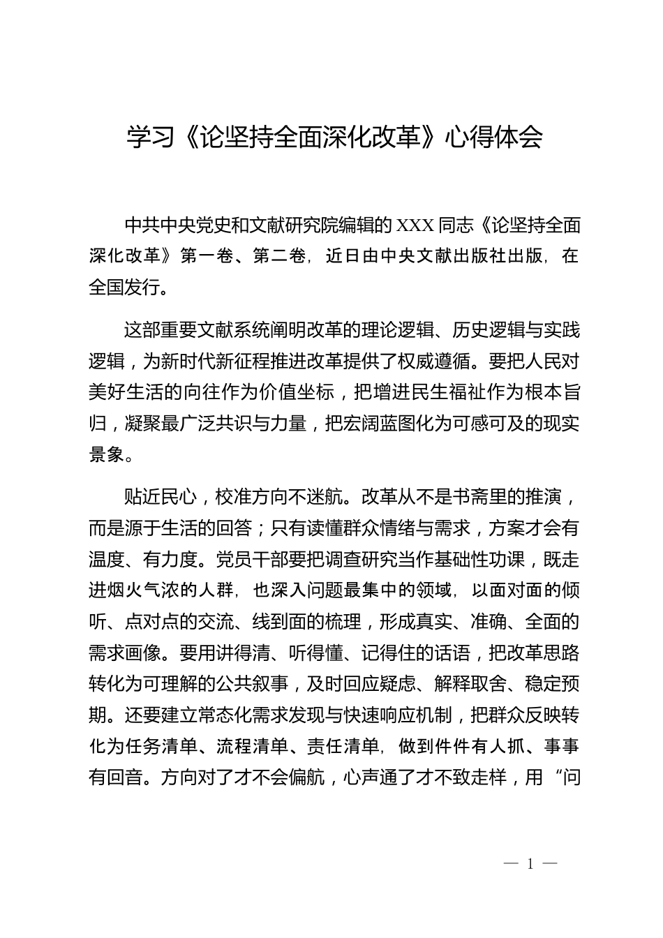 學(xué)習(xí)《論堅持全面深化改革》心得體會中共中央黨史和文獻研究院編輯的XXX同志《論堅持全面深化改革》第一卷、第二卷,近日由中央文獻出版社出版,在全國發(fā)行。這部重要文獻系統(tǒng)闡明改革的理論邏輯、歷史邏輯與實踐邏輯,為新時代新征程推進改革提供了權(quán)威遵循。要把人民對美好生活的向往作為價值坐標(biāo),把增進民生福祉作為根本旨歸,凝聚最廣泛共識與力量,把宏闊藍圖化為可感可及的現(xiàn)實景象。貼近民心,校準(zhǔn)方向不迷航。改革從不是書齋里的推演,而是源于生活的回答;只有讀懂群眾情緒與需求,方案才會有溫度、有力度。黨員干部要把調(diào)查研究當(dāng)作基礎(chǔ)性功課,既走煙火氣的...
