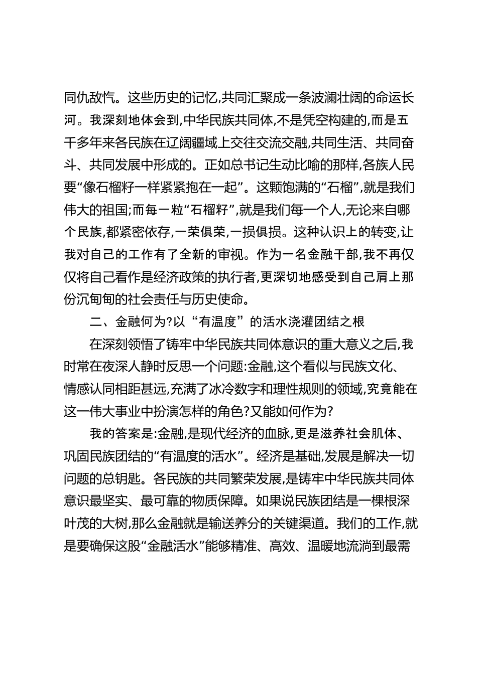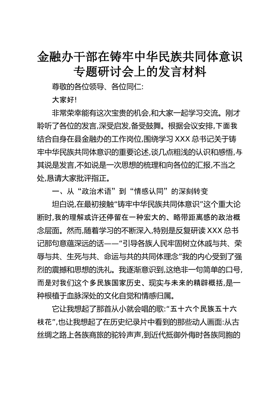 金融辦干部在鑄牢中華民族共同體意識專題研討會上的發(fā)言材料尊敬的各位領(lǐng)導(dǎo)、各位同仁:大家好!非常榮幸能有這次寶貴的機會,和大家一起學(xué)習(xí)交流。剛才聆聽了各位的發(fā)言,深受啟發(fā),備受鼓舞。根據(jù)會議安排,下面我結(jié)合自身在縣金融辦的工作崗位,圍繞學(xué)習(xí)XXX總書記關(guān)于鑄牢中華民族共同體意識的重要論述,談幾點粗淺的認識和感悟,與其說是發(fā)言,不如說是一次思想的梳理和向各位的匯報,不當(dāng)之處,懇請大家批評指正。一、從“政治術(shù)語”到“情感認同”的深刻轉(zhuǎn)變坦白說,“”在最初接觸鑄牢中華民族共同體意識這個重大論斷時,我的理解或停留在一種宏大的、略距離感的政治概許還帶念...