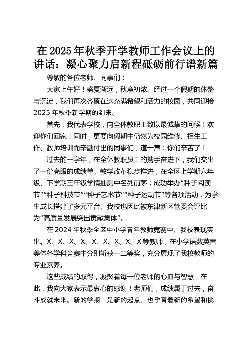 在2025年秋季開學(xué)教師工作會議上的講話:凝心聚力啟新程砥礪前行譜新篇VIP免費