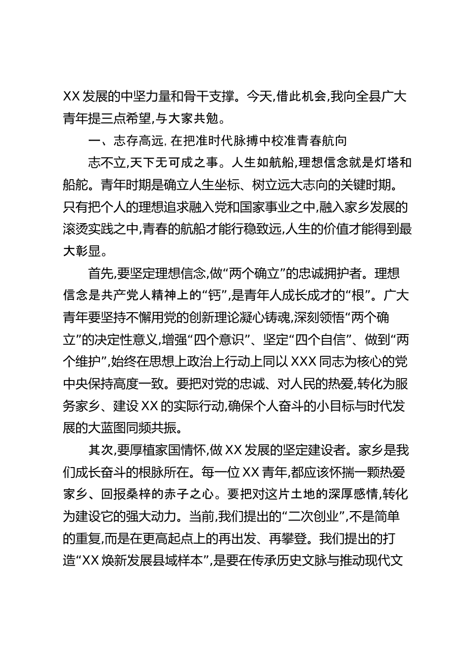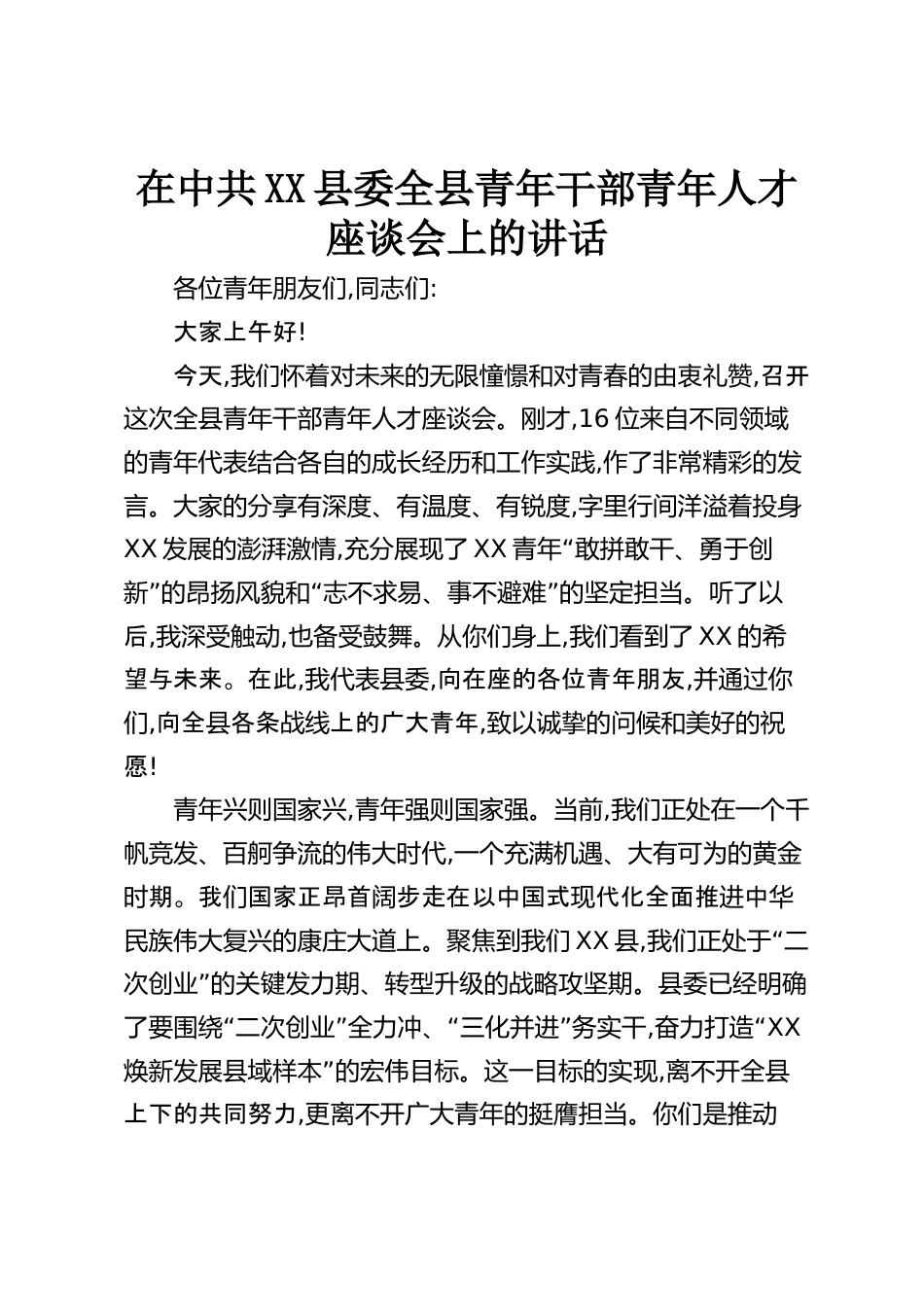 在中共XX縣委全縣青年干部青年人才座談會上的講話各位青年朋友們,同志們:大家上午好!今天,我們懷著對未來的無限憧憬和對青春的由衷禮贊,召開這次全縣青年干部青年人才座談會。剛才,16位來自不同領域的青年代表結合各自的成長經歷和工作實踐,作了非常精彩的發(fā)言。大家的分享有深度、有溫度、有銳度,字里行間洋溢著投身XX發(fā)展的澎湃激情,充分展現了XX“青年敢拼敢干、勇于創(chuàng)”“”新的昂揚風貌和志不求易、事不避難的堅定擔當。聽了以后,我深受觸動,也備受鼓舞。從你們身上,我們看到了XX的希望與未來。在此,我代表縣委,向在座的各位青年朋友,并通過你們,向全各條上的廣大青...