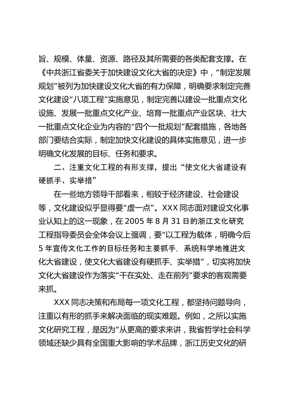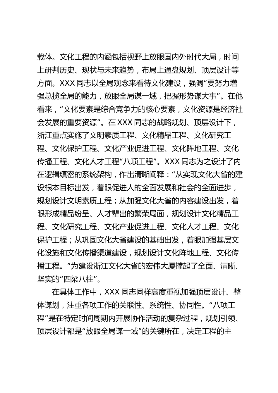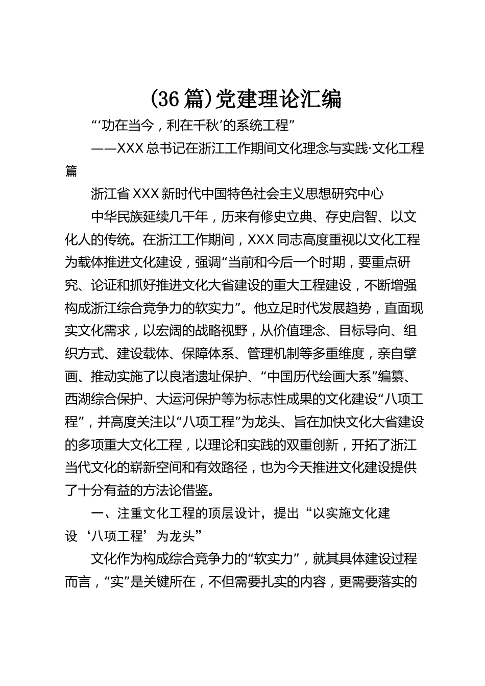 (36篇)黨建理論匯編“‘’”功在當(dāng)今,利在千秋的系統(tǒng)工程——XXX總書(shū)記在浙江工作期間文化理念與實(shí)踐·文化工程篇浙江省XXX新時(shí)代中國(guó)特色社會(huì)主義思想研究中心中華民族延續(xù)幾千年,歷來(lái)有修史立典、存史啟智、以文化人的傳統(tǒng)。在浙江工作期間,XXX同志高度重視以文化工程“為載體推進(jìn)文化建設(shè),強(qiáng)調(diào)當(dāng)前和今后一個(gè)時(shí)期,要重點(diǎn)研究、論證和抓好推進(jìn)文化大省建設(shè)的重大工程建設(shè),不斷增強(qiáng)”構(gòu)成浙江綜合競(jìng)爭(zhēng)力的軟實(shí)力。他立足時(shí)代發(fā)展趨勢(shì),直面現(xiàn)實(shí)文化需求,以宏闊的戰(zhàn)略視野,從價(jià)值理念、目標(biāo)導(dǎo)向、組織方式、建設(shè)載體、保障體系、管理機(jī)制等多重維度,親自擘“”...