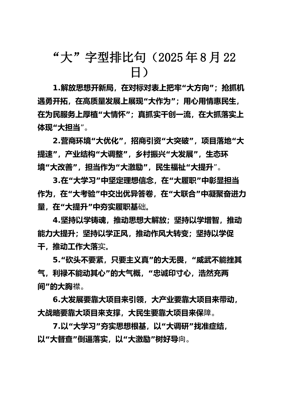 “大”字型排比句(2025年8月22日)1.“”解放思想開新局,在對標(biāo)對表上把牢大方向;搶抓機(jī)“”遇勇開拓,在高質(zhì)量發(fā)展上展現(xiàn)大作為;用心用情惠民生,“”在為民服務(wù)上厚植大情懷;真抓實(shí)干創(chuàng)一流,在大抓落實(shí)上“體現(xiàn)大擔(dān)當(dāng)”。2.“”“”“營商環(huán)境大優(yōu)化,招商引資大突破,項目落地大”“”“”提速,產(chǎn)業(yè)結(jié)構(gòu)大調(diào)整,鄉(xiāng)村振興大發(fā)展,生態(tài)環(huán)“”“”“境大改善,擔(dān)當(dāng)作為大激勵,民生福祉大提升”。3.“”“”在大學(xué)習(xí)中堅定理想信念,在大履職中彰顯擔(dān)當(dāng)“”“”作為,在大考驗中交出優(yōu)異答卷,在大聯(lián)合中凝聚奮進(jìn)力“”量,在大提升中夯實(shí)履職基礎(chǔ)。4.堅持以學(xué)鑄...