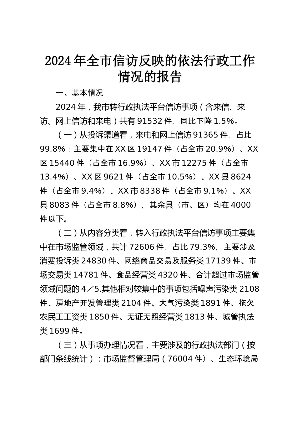 2024年全市信訪反映的依法行政工作情況的報(bào)告一、基本情況2024年,我市轉(zhuǎn)行政執(zhí)法平臺(tái)信訪事項(xiàng)(含來(lái)信、來(lái)訪、網(wǎng)上信訪和來(lái)電)共有91532件,同比下降1.5%。(一)從投訴渠道看,來(lái)電和網(wǎng)上信訪91365件,占比99.8%;主要集中在XX區(qū)19147件(占全市20.9%)、XX區(qū)15440件(占全市16.9%)、XX市12275件(占全市13.4%)、XX區(qū)9621件(占全市10.5%)、XX縣8624件(占全市9.4%)、XX市8338件(占全市9.1%)、XX縣8083件(占全市8.8%),其余縣(市、區(qū))均在4000件以下。(二)從內(nèi)容分類看,轉(zhuǎn)入行政執(zhí)法平臺(tái)信訪事項(xiàng)主要集中在市場(chǎng)監(jiān)管領(lǐng)域,共計(jì)72606件,占比79.3...