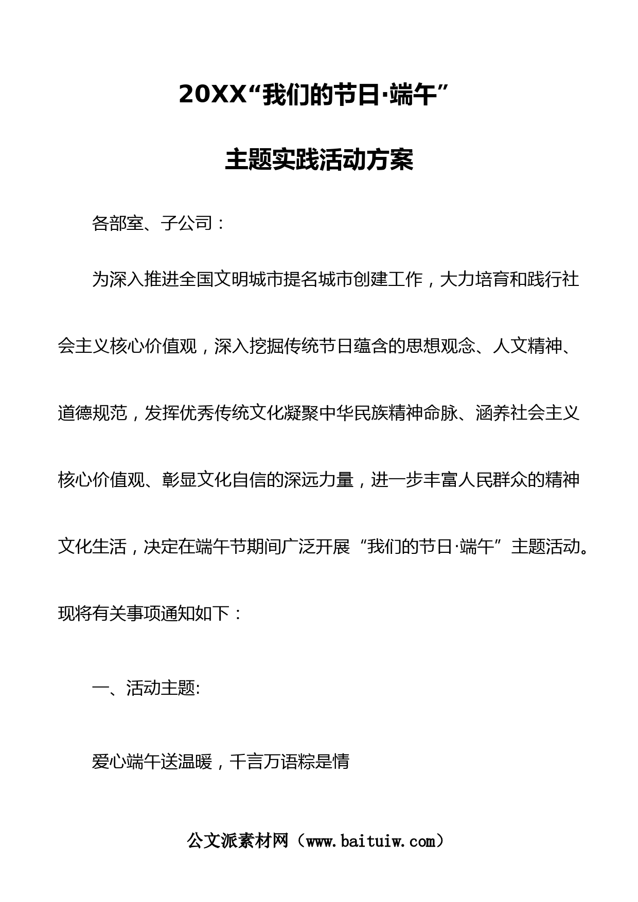20XX“我們的節(jié)日·端午”主題實(shí)踐活動方案各部室、子公司:為深入推進(jìn)全國文明城市提名城市創(chuàng)建工作,大力培育和踐行社會主義核心價值觀,深入挖掘傳統(tǒng)節(jié)日蘊(yùn)含的思想觀念、人文精神、道德規(guī)范,發(fā)揮優(yōu)秀傳統(tǒng)文化凝聚中華民族精神命脈、涵養(yǎng)社會主義核心價值觀、彰顯文化自信的深遠(yuǎn)力量,進(jìn)一步豐富人民群眾的精神文化生活,決定在端午節(jié)期間廣泛開展“我們的節(jié)日·端午”主題活動?,F(xiàn)將有關(guān)事項通知如下:一、活動主題:愛心端午送溫暖,千言萬語粽是情公文派素材網(wǎng)(www.huangminedu.com.cn)二、活動時間:20XX年X月XX日上午9:00三、活動地點(diǎn):xxx、xxx工地四、參加人員:新...