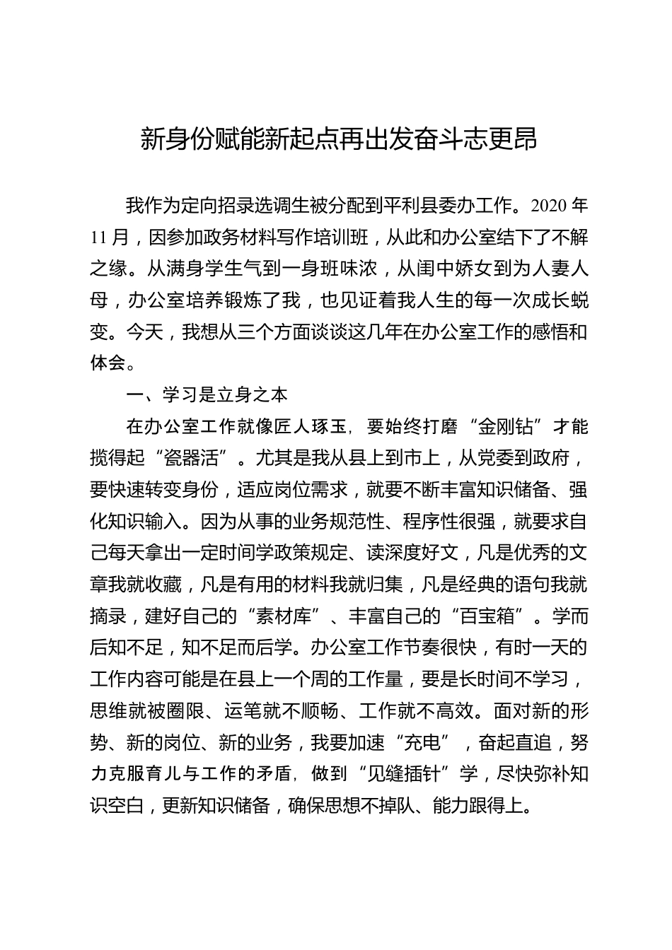 新身份賦能新起點(diǎn)再出發(fā)奮斗志更昂我作為定向招錄選調(diào)生被分配到平利縣委辦工作。2020年11月,因參加政務(wù)材料寫作培訓(xùn)班,從此和辦公室結(jié)下了不解之緣。從滿身學(xué)生氣到一身班味濃,從閨中嬌女到為人妻人母,辦公室培養(yǎng)鍛煉了我,也見證著我人生的每一次成長(zhǎng)蛻變。今天,我想從三個(gè)方面談?wù)勥@幾年在辦公室工作的感悟和體會(huì)。一、學(xué)習(xí)是立身之本在公室工作就像匠人琢玉,要始打磨辦終“金剛鉆”才能攬得起“瓷器活”。尤其是我從縣上到市上,從黨委到政府,要快速轉(zhuǎn)變身份,適應(yīng)崗位需求,就要不斷豐富知識(shí)儲(chǔ)備、強(qiáng)化知識(shí)輸入。因?yàn)閺氖碌臉I(yè)務(wù)規(guī)范性、程序性很強(qiáng),就要求自...