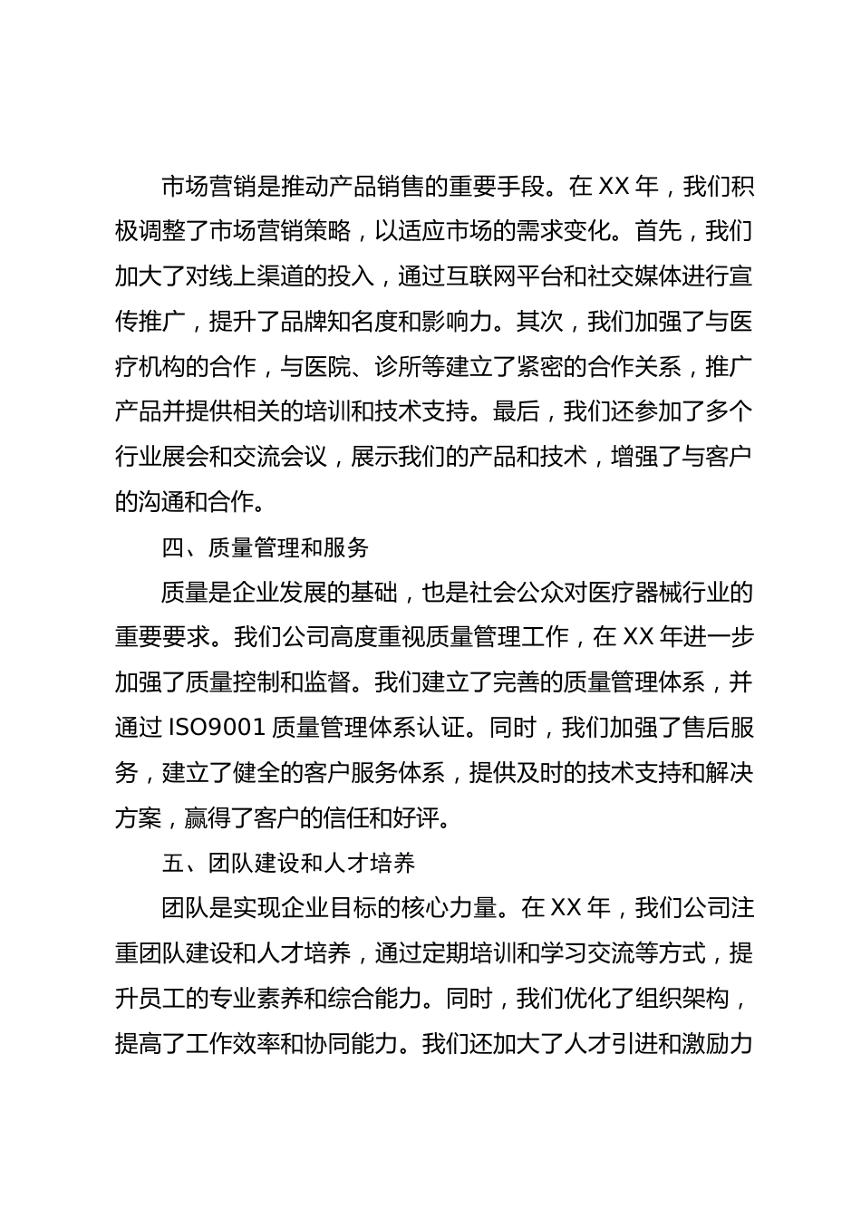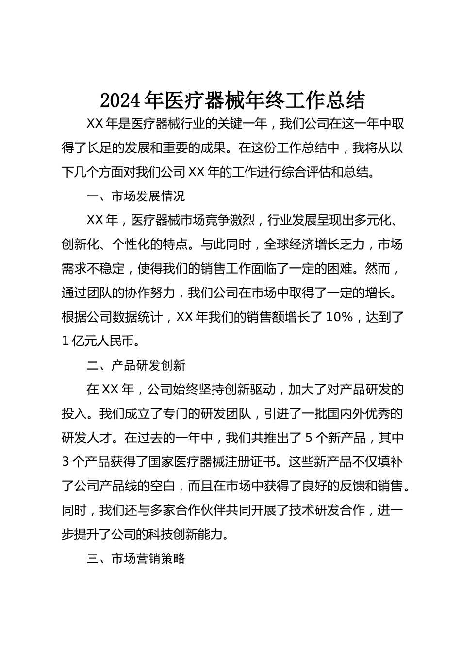 2024年醫(yī)療器械年終工作總結(jié)XX年是醫(yī)療器械行業(yè)的關(guān)鍵一年,我們公司在這一年中取得了長足的發(fā)展和重要的成果。在這份工作總結(jié)中,我將從以下幾個(gè)方面對(duì)我們公司XX年的工作進(jìn)行綜合評(píng)估和總結(jié)。一、市場發(fā)展情況XX年,醫(yī)療器械市場競爭激烈,行業(yè)發(fā)展呈現(xiàn)出多元化、創(chuàng)新化、個(gè)性化的特點(diǎn)。與此同時(shí),全球經(jīng)濟(jì)增長乏力,市場需求不穩(wěn)定,使得我們的銷售工作面臨了一定的困難。然而,通過團(tuán)隊(duì)的協(xié)作努力,我們公司在市場中取得了一定的增長。根據(jù)公司數(shù)據(jù)統(tǒng)計(jì),XX年我們的銷售額增長了10%,達(dá)到了1億元人民幣。二、產(chǎn)品研發(fā)創(chuàng)新在XX年,公司始終堅(jiān)持創(chuàng)新驅(qū)動(dòng),加大了對(duì)產(chǎn)品...