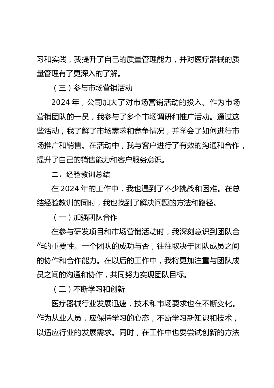 2024醫(yī)療器械工作總結(jié)一、工作回顧2024年是醫(yī)療器械領(lǐng)域發(fā)展迅猛的一年。在這一年中,我作為醫(yī)療器械公司的一名員工,參與了許多重要的工作和項目。在這個總結(jié)中,將對我在2024年的工作進行回顧并總結(jié)經(jīng)驗教訓。(一)參與新產(chǎn)品的研發(fā)2024年,公司開展了多個新產(chǎn)品的研發(fā)項目。我作為研發(fā)團隊成員,參與了其中的兩個項目。通過參與這些項目,我深入了解了醫(yī)療器械研發(fā)的各個環(huán)節(jié)以及團隊合作的重要性。在這個過程中,我學會了如何與團隊成員進行有效溝通和協(xié)作,同時也嘗試了一些創(chuàng)新的研發(fā)方法和技術(shù)。雖然在項目過程中遇到了一些挑戰(zhàn),但最終我們成功地開發(fā)出了符合市...