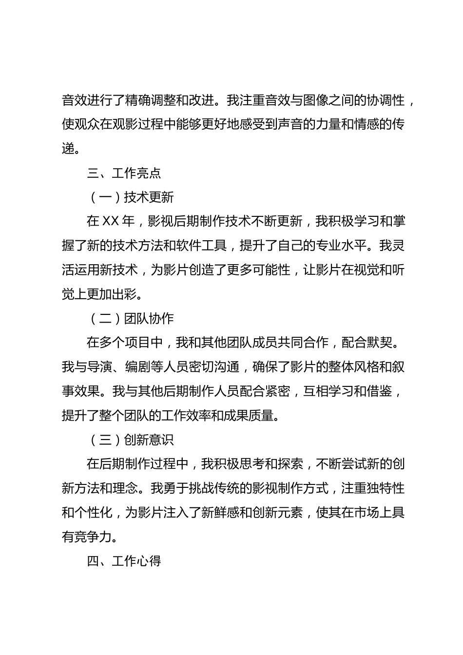 XX年影視后期制作個(gè)人工作總結(jié)一、工作背景XX年是影視后期制作行業(yè)的關(guān)鍵性一年,在這一年里,我作為影視后期制作團(tuán)隊(duì)的核心成員,承擔(dān)了多個(gè)影視作品的后期制作工作。我所參與的項(xiàng)目包括電影、電視劇、紀(jì)錄片等不同類(lèi)型的影視作品,其中涉及到的工作內(nèi)容包括剪輯、特效制作、音頻處理等多個(gè)方面。二、工作成果(一)剪輯工作在剪輯方面,我按照導(dǎo)演和編劇的要求,提供了精確、流暢的剪輯作品。我對(duì)于劇情的把握準(zhǔn)確,能夠準(zhǔn)確地展現(xiàn)故事的發(fā)展和情感的變化,對(duì)于影片的節(jié)奏和時(shí)長(zhǎng)把握得恰到好處。我的剪輯作品獲得了觀眾和專(zhuān)業(yè)人士的一致好評(píng)。(二)特效制作在特效制作...