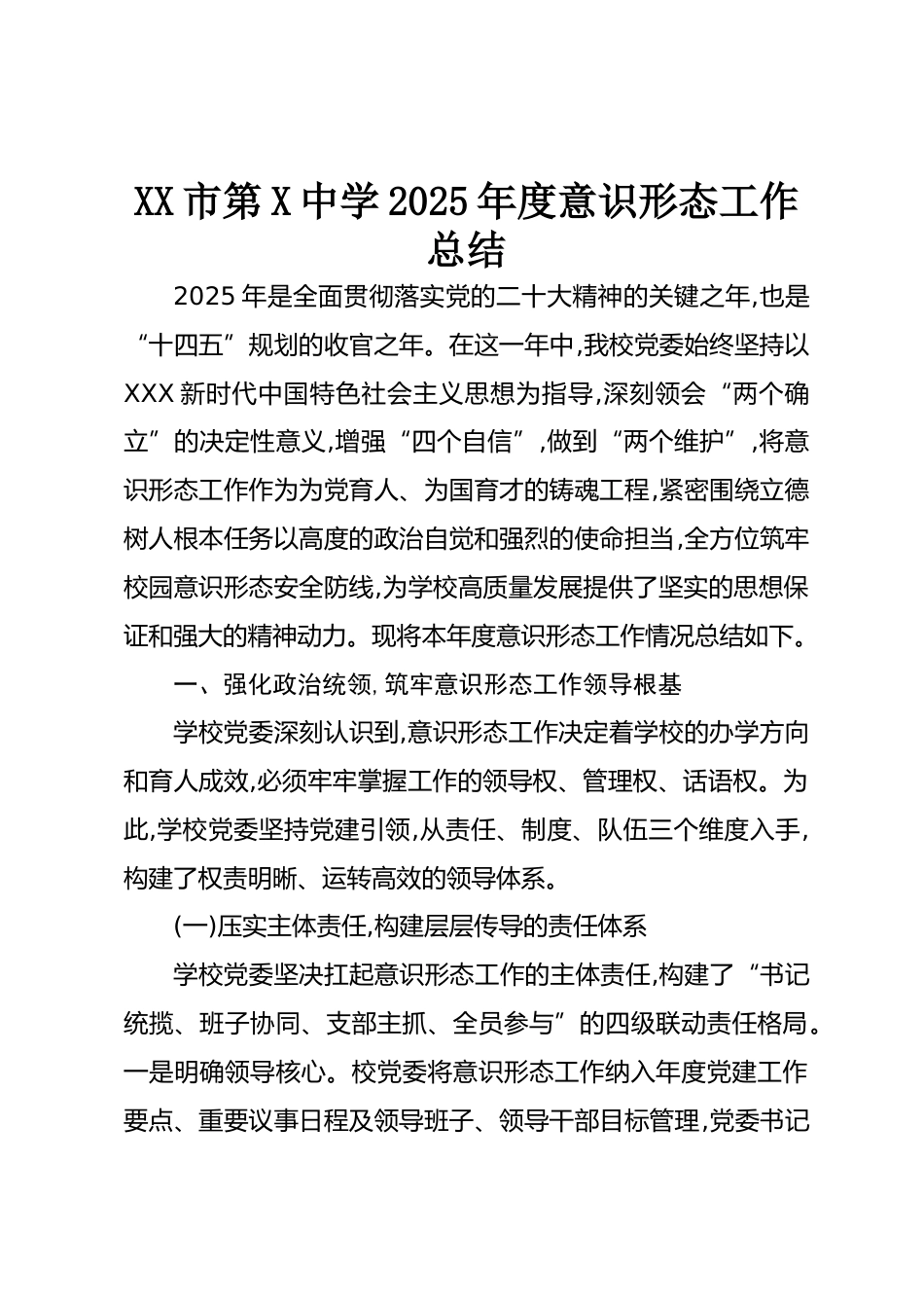 XX市第X中學(xué)2025年度意識(shí)形態(tài)工作總結(jié)2025年是全面貫徹落實(shí)黨的二十大精神的關(guān)鍵之年,也是“十四五”規(guī)劃的收官之年。在這一年中,我校黨委始終堅(jiān)持以XXX新時(shí)代中國(guó)特色社會(huì)主義思想為指導(dǎo),深刻領(lǐng)會(huì)“兩個(gè)確立”的決定性意義,增強(qiáng)“四個(gè)自信”,做到“兩個(gè)維護(hù)”,將意識(shí)形態(tài)工作作為為黨育人、為國(guó)育才的鑄魂工程,緊密圍繞立德樹人根本任務(wù)以高度的政治自覺和強(qiáng)烈的使命擔(dān)當(dāng),全方位筑牢校園意識(shí)形態(tài)安全防線,為學(xué)校高質(zhì)量發(fā)展提供了堅(jiān)實(shí)的思想保證和強(qiáng)大的精神動(dòng)力。現(xiàn)將本年度意識(shí)形態(tài)工作情況總結(jié)如下。一、強(qiáng)化政治統(tǒng)領(lǐng),筑牢意識(shí)形態(tài)工作領(lǐng)導(dǎo)根基學(xué)校黨委深刻認(rèn)識(shí)到,意...