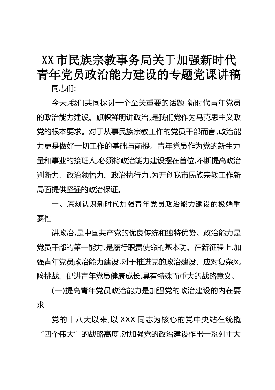 XX市民族宗教事務(wù)局關(guān)于加強(qiáng)新時(shí)代青年黨員政治能力建設(shè)的專題黨課講稿同志們:今天,我們共同探討一個(gè)至關(guān)重要的話題:新時(shí)代青年黨員的政治能力建設(shè)。旗幟鮮明講政治,是我們黨作為馬克思主義政黨的根本要求。對于從事民族宗教工作的黨員干部而言,政治能力更是做好一切工作的基礎(chǔ)與前提。青年黨員作為黨的新生力量和事業(yè)的接班人,必須將政治能力建設(shè)擺在首位,不斷提高政治判斷力、政治領(lǐng)悟力、政治執(zhí)行力,為開創(chuàng)我市民族宗教工作新局面提供堅(jiān)強(qiáng)的政治保證。一、深刻認(rèn)識新時(shí)代加強(qiáng)青年黨員政治能力建設(shè)的極端重要性講政治,是中國共產(chǎn)黨的優(yōu)良傳統(tǒng)和獨(dú)特優(yōu)勢。政治能力是黨...