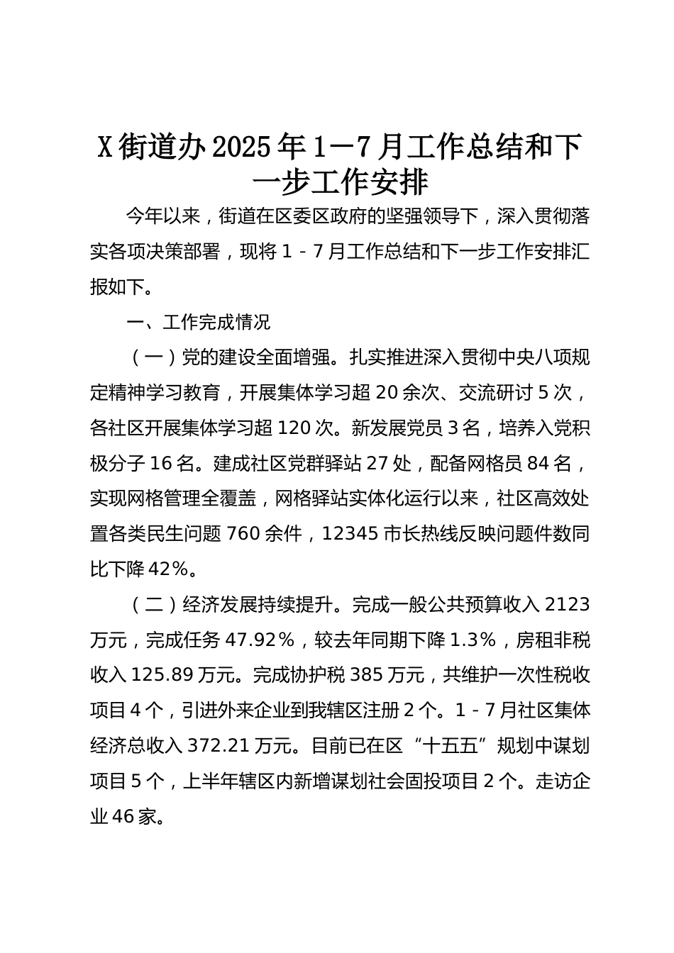 X街道辦2025年1-7月工作總結(jié)和下一步工作安排