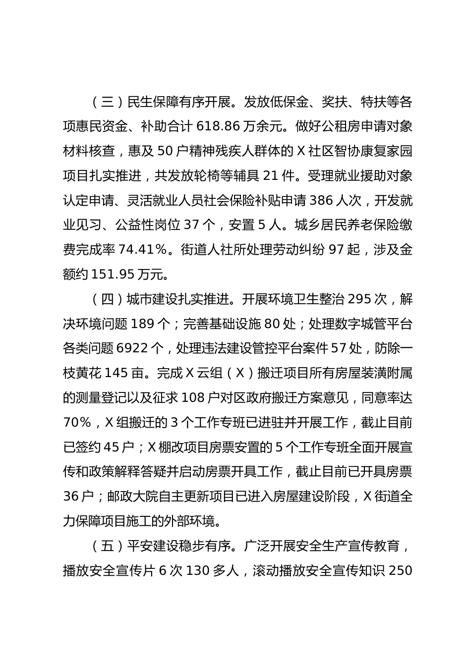 X街道辦2025年1-7月工作總結(jié)和下一步工作安排今年以來,街道在區(qū)委區(qū)政府的堅強領(lǐng)導(dǎo)下,深入貫徹落實各項決策部署,現(xiàn)將1-7月工作總結(jié)和下一步工作安排匯報如下。一、工作完成情況(一)黨的建設(shè)全面增強。扎實推進(jìn)深入貫徹中央八項規(guī)定精神學(xué)習(xí)教育,開展集體學(xué)習(xí)超20余次、交流研討5次,各社區(qū)開展集體學(xué)習(xí)超120次。新發(fā)展黨員3名,培養(yǎng)入黨積極分子16名。建成社區(qū)黨群驛站27處,配備網(wǎng)格員84名,實現(xiàn)網(wǎng)格管理全覆蓋,網(wǎng)格驛站實體化運行以來,社區(qū)高效處置各類民生問題760余件,12345市長熱線反映問題件數(shù)同比下降42%。(二)經(jīng)濟(jì)發(fā)展持續(xù)提升。完成一般公共預(yù)算收...