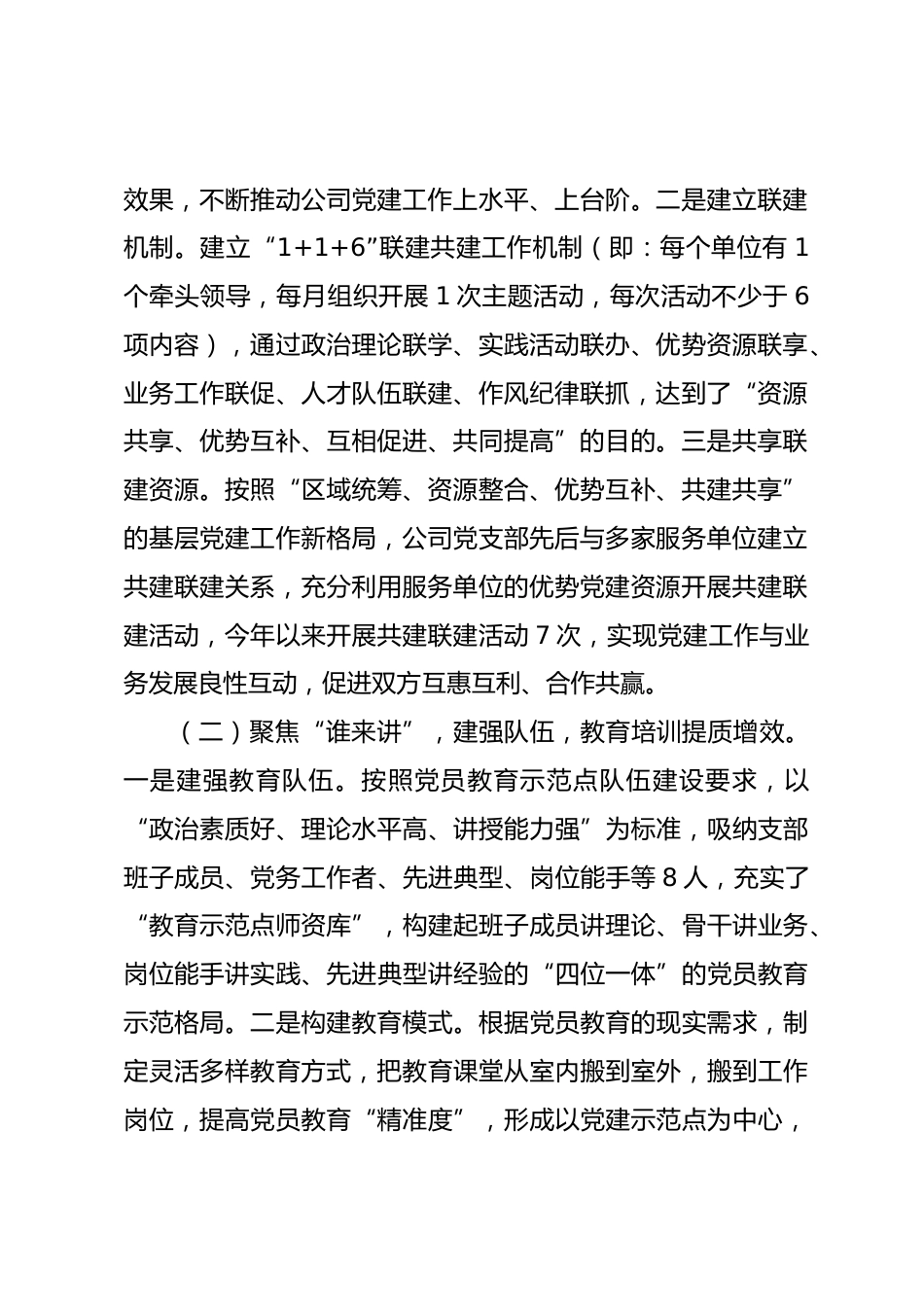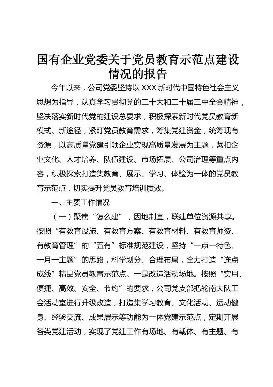 國有企業(yè)黨委關于黨員教育示范點建設情況的報告今年以來,公司黨委堅持以XXX新時代中國特色社會主義思想為指導,認真學習貫徹黨的二十大和二十屆三中全會精神,堅決落實新時代黨的建設總要求,積極探索新時代黨員教育新模式、新途徑,緊盯黨員教育需求,籌集黨建資金,統(tǒng)籌現(xiàn)有資源,以高質量黨建引領企業(yè)實現(xiàn)高質量發(fā)展為主題,緊扣企業(yè)文化、人才培養(yǎng)、隊伍建設、市場拓展、公司治理等重點內容,積極探索打造集教育、展示、學習、體驗為一體的黨員教育示范點,切實提升黨員教育培訓質效。一、主要工作情況(一)聚焦“怎么建”,因地制宜,聯(lián)建單位資源共享。按照“有...