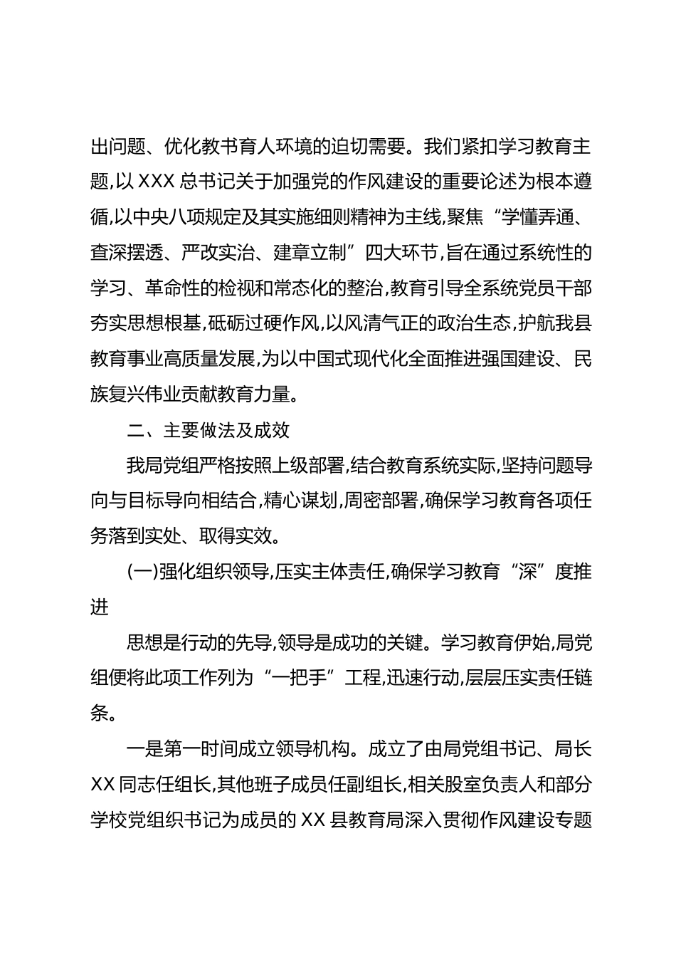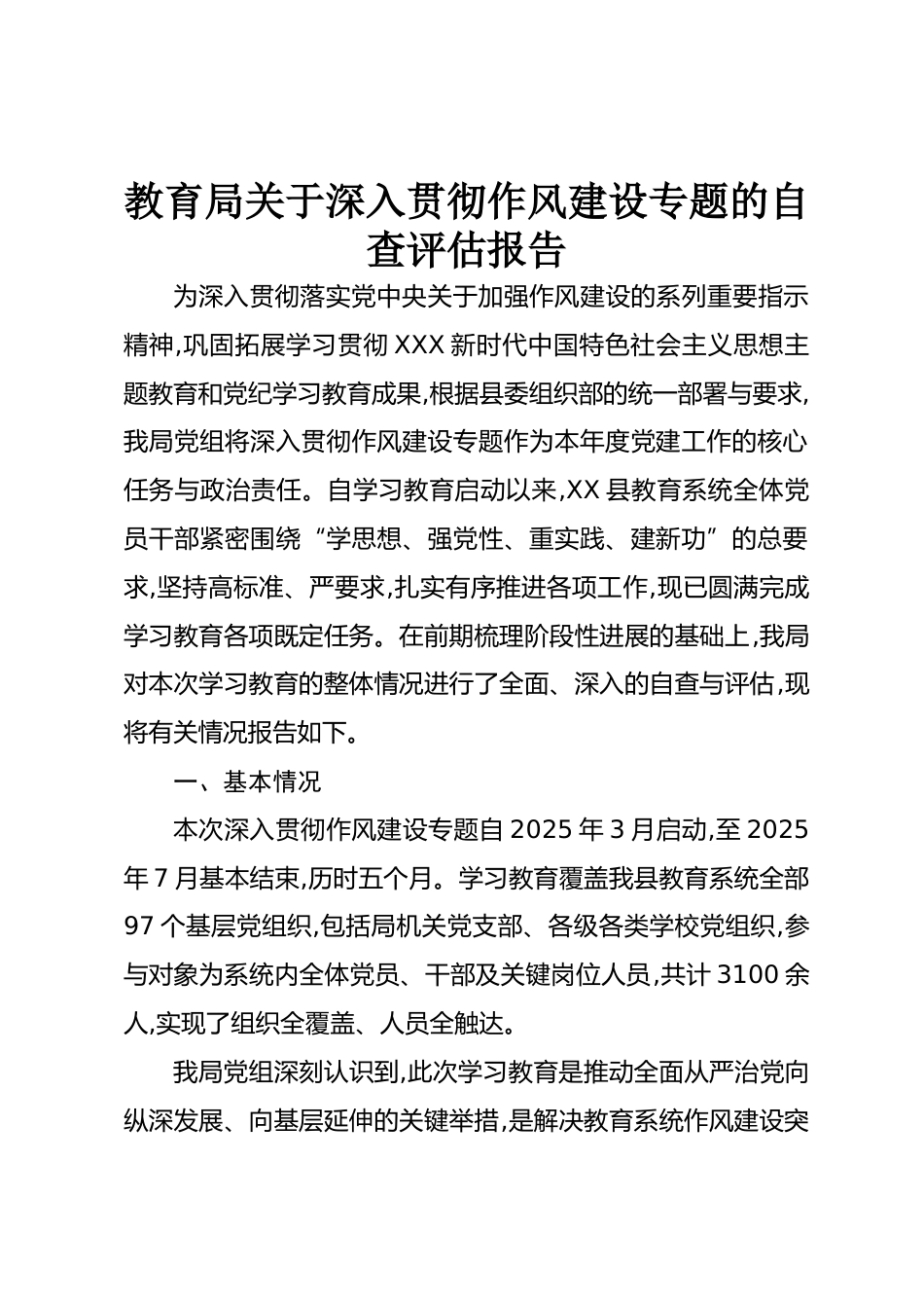 教育局關(guān)于深入貫徹作風(fēng)建設(shè)專題的自查評(píng)估報(bào)告為深入貫徹落實(shí)黨中央關(guān)于加強(qiáng)作風(fēng)建設(shè)的系列重要指示精神,鞏固拓展學(xué)習(xí)貫徹XXX新時(shí)代中國(guó)特色社會(huì)主義思想主題教育和黨紀(jì)學(xué)習(xí)教育成果,根據(jù)縣委組織部的統(tǒng)一部署與要求,我局黨組將深入貫徹作風(fēng)建設(shè)專題作為本年度黨建工作的核心任務(wù)與政治責(zé)任。自學(xué)習(xí)教育啟動(dòng)以來,XX縣教育系統(tǒng)全體黨員干部緊密圍繞“學(xué)思想、強(qiáng)黨性、重實(shí)踐、建新功”的總要求,堅(jiān)持高標(biāo)準(zhǔn)、嚴(yán)要求,扎實(shí)有序推進(jìn)各項(xiàng)工作,現(xiàn)已圓滿完成學(xué)習(xí)教育各項(xiàng)既定任務(wù)。在前期梳理階段性進(jìn)展的基礎(chǔ)上,我局對(duì)本次學(xué)習(xí)教育的整體情況進(jìn)行了全面、深入的自查與評(píng)估,現(xiàn)將...