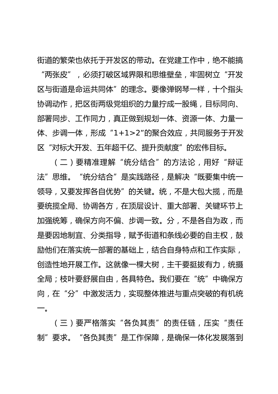 區(qū)黨工委副書記在2025年黨建工作聯(lián)席會(huì)議上的講話同志們:剛才,我們審議通過(guò)了《關(guān)于進(jìn)一步深化區(qū)街黨建一體化發(fā)展的實(shí)施方案》,*街道黨工委也作了很好的交流發(fā)言。黨建是引領(lǐng)發(fā)展的“根”與“魂”,開(kāi)發(fā)區(qū)作為經(jīng)濟(jì)建設(shè)的主戰(zhàn)場(chǎng),也必然是黨的建設(shè)的主陣地。抓好區(qū)街黨建一體化發(fā)展,是提升開(kāi)發(fā)區(qū)整體黨建質(zhì)效、服務(wù)保障高質(zhì)量發(fā)展的關(guān)鍵一招。我們必須深刻認(rèn)識(shí)到,抓好黨建是最大的責(zé)任,不抓黨建是最大的失職。黨建強(qiáng)則經(jīng)濟(jì)強(qiáng),只有把黨建這個(gè)“主心骨”立起來(lái)、強(qiáng)起來(lái),我們的發(fā)展才有方向、有力量、有保障。一、在深化認(rèn)識(shí)中把握“三個(gè)關(guān)系”,筑牢區(qū)街黨建一體化...