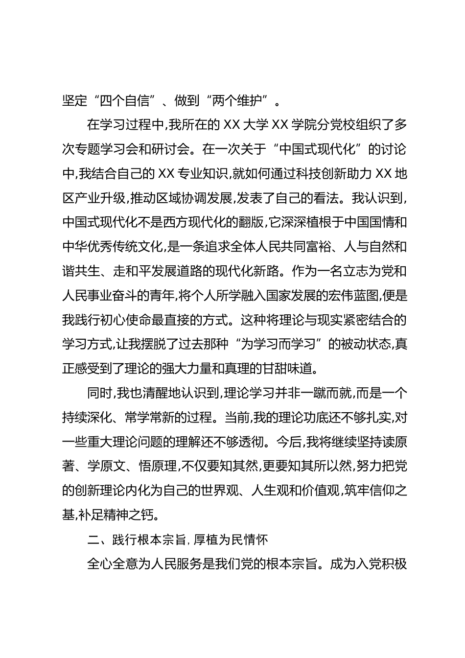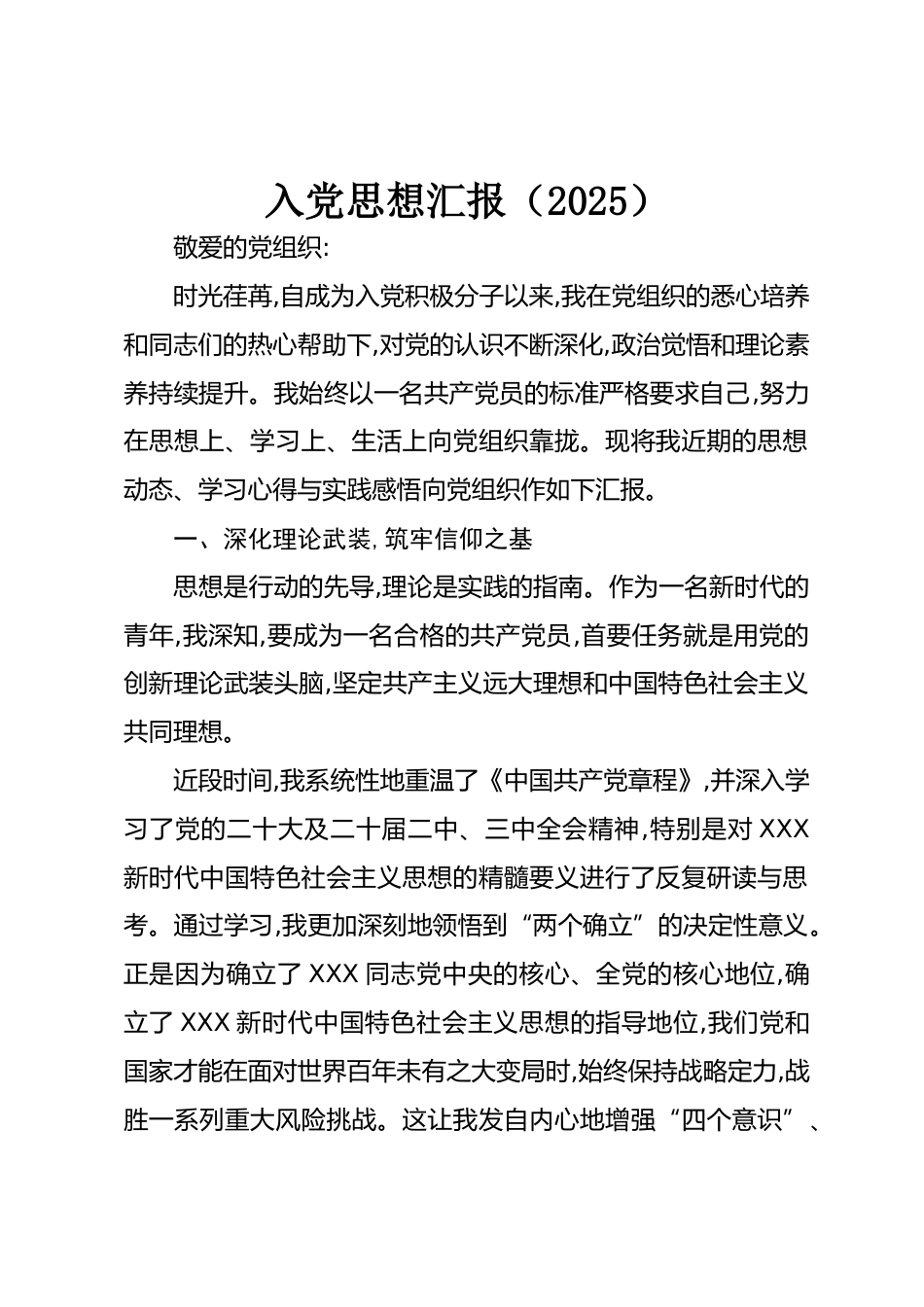 入黨思想?yún)R報(bào)(2025)敬愛(ài)的黨組織:時(shí)光荏苒,自成為入黨積極分子以來(lái),我在黨組織的悉心培養(yǎng)和同志們的熱心幫助下,對(duì)黨的認(rèn)識(shí)不斷深化,政治覺(jué)悟和理論素養(yǎng)持續(xù)提升。我始終以一名共產(chǎn)黨員的標(biāo)準(zhǔn)嚴(yán)格要求自己,努力在思想上、學(xué)習(xí)上、生活上向黨組織靠攏?,F(xiàn)將我近期的思想動(dòng)態(tài)、學(xué)習(xí)心得與實(shí)踐感悟向黨組織作如下匯報(bào)。一、深化理論武裝,筑牢信仰之基思想是行動(dòng)的先導(dǎo),理論是實(shí)踐的指南。作為一名新時(shí)代的青年,我深知,要成為一名合格的共產(chǎn)黨員,首要任務(wù)就是用黨的創(chuàng)新理論武裝頭腦,堅(jiān)定共產(chǎn)主義遠(yuǎn)大理想和中國(guó)特色社會(huì)主義共同理想。近段時(shí)間,我系統(tǒng)性地重溫了《中國(guó)共產(chǎn)...