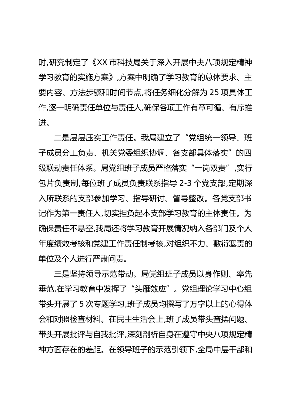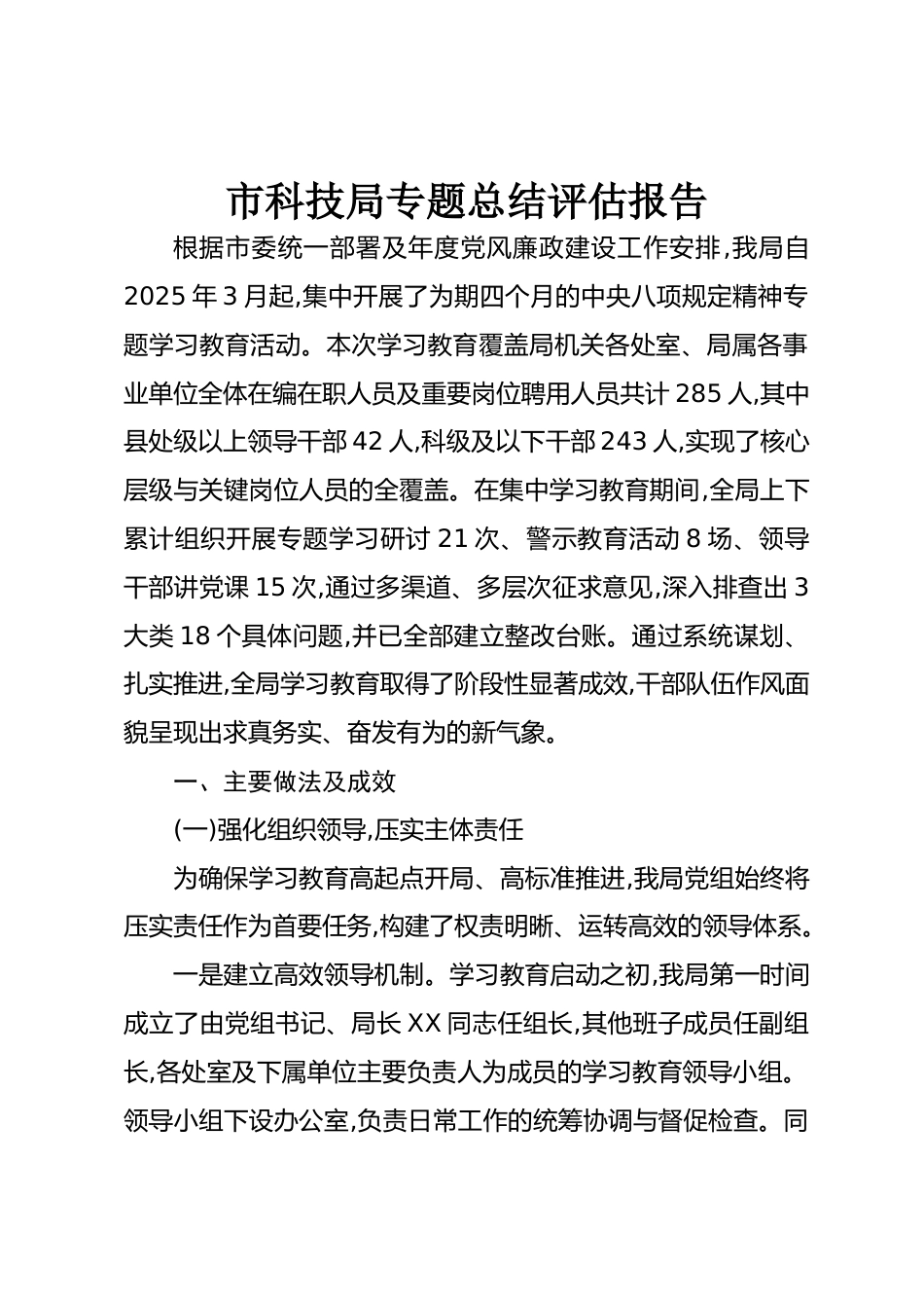 市科技局專(zhuān)題總結(jié)評(píng)估報(bào)告根據(jù)市委統(tǒng)一部署及年度黨風(fēng)廉政建設(shè)工作安排,我局自2025年3月起,集中開(kāi)展了為期四個(gè)月的中央八項(xiàng)規(guī)定精神專(zhuān)題學(xué)習(xí)教育活動(dòng)。本次學(xué)習(xí)教育覆蓋局機(jī)關(guān)各處室、局屬各事業(yè)單位全體在編在職人員及重要崗位聘用人員共計(jì)285人,其中縣處級(jí)以上領(lǐng)導(dǎo)干部42人,科級(jí)及以下干部243人,實(shí)現(xiàn)了核心層級(jí)與關(guān)鍵崗位人員的全覆蓋。在集中學(xué)習(xí)教育期間,全局上下累計(jì)組織開(kāi)展專(zhuān)題學(xué)習(xí)研討21次、警示教育活動(dòng)8場(chǎng)、領(lǐng)導(dǎo)干部講黨課15次,通過(guò)多渠道、多層次征求意見(jiàn),深入排查出3大類(lèi)18個(gè)具體問(wèn)題,并已全部建立整改臺(tái)賬。通過(guò)系統(tǒng)謀劃、扎實(shí)推進(jìn),全局學(xué)習(xí)教育取得了階段...
