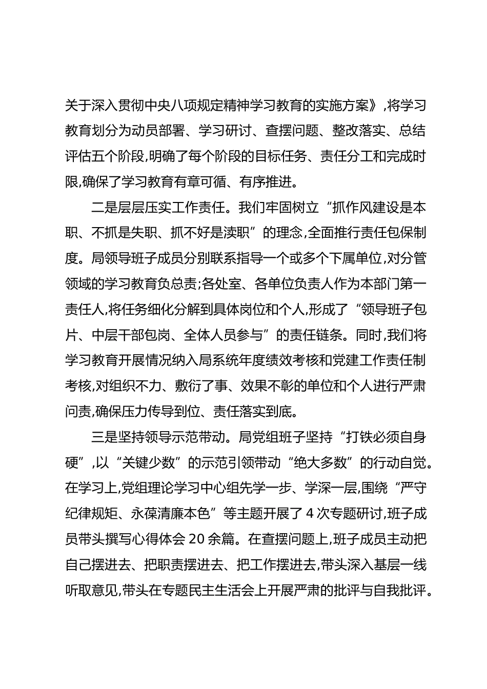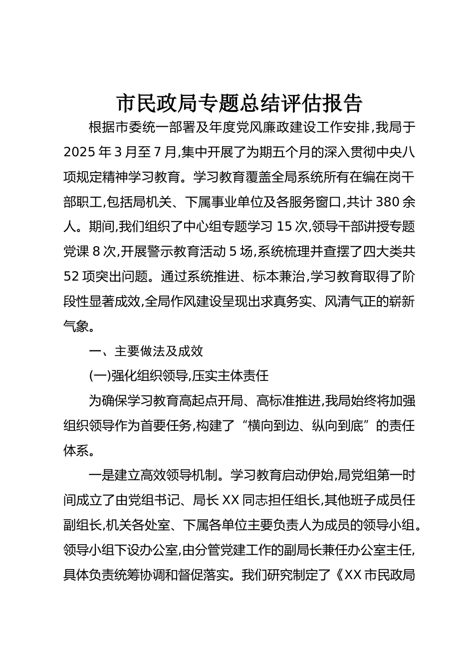 市民政局專題總結(jié)評(píng)估報(bào)告根據(jù)市委統(tǒng)一部署及年度黨風(fēng)廉政建設(shè)工作安排,我局于2025年3月至7月,集中開展了為期五個(gè)月的深入貫徹中央八項(xiàng)規(guī)定精神學(xué)習(xí)教育。學(xué)習(xí)教育覆蓋全局系統(tǒng)所有在編在崗干部職工,包括局機(jī)關(guān)、下屬事業(yè)單位及各服務(wù)窗口,共計(jì)380余人。期間,我們組織了中心組專題學(xué)習(xí)15次,領(lǐng)導(dǎo)干部講授專題黨課8次,開展警示教育活動(dòng)5場(chǎng),系統(tǒng)梳理并查擺了四大類共52項(xiàng)突出問題。通過系統(tǒng)推進(jìn)、標(biāo)本兼治,學(xué)習(xí)教育取得了階段性顯著成效,全局作風(fēng)建設(shè)呈現(xiàn)出求真務(wù)實(shí)、風(fēng)清氣正的嶄新氣象。一、主要做法及成效(一)強(qiáng)化組織領(lǐng)導(dǎo),壓實(shí)主體責(zé)任為確保學(xué)習(xí)教育高起點(diǎn)開局、高標(biāo)準(zhǔn)...