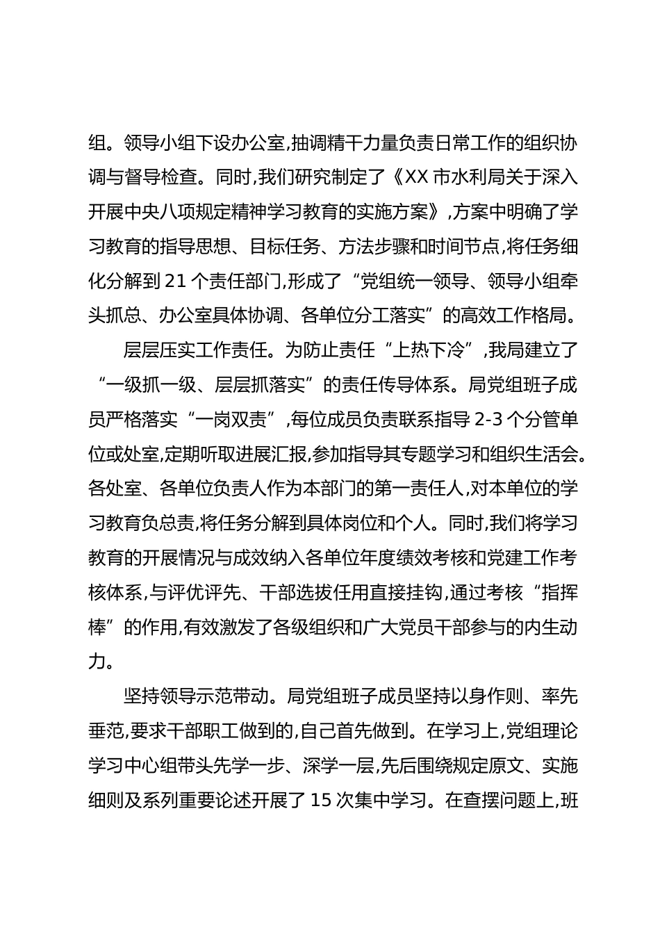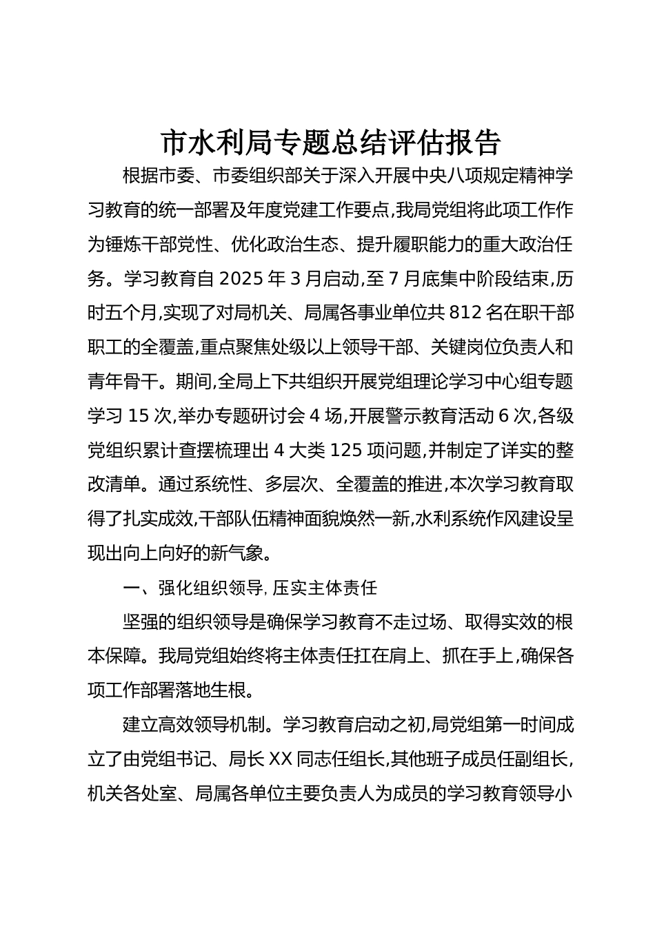 市水利局專題總結評估報告根據(jù)市委、市委組織部關于深入開展中央八項規(guī)定精神學習教育的統(tǒng)一部署及年度黨建工作要點,我局黨組將此項工作作為錘煉干部黨性、優(yōu)化政治生態(tài)、提升履職能力的重大政治任務。學習教育自2025年3月啟動,至7月底集中階段結束,歷時五個月,實現(xiàn)了對局機關、局屬各事業(yè)單位共812名在職干部職工的全覆蓋,重點聚焦處級以上領導干部、關鍵崗位負責人和青年骨干。期間,全局上下共組織開展黨組理論學習中心組專題學習15次,舉辦專題研討會4場,開展警示教育活動6次,各級黨組織累計查擺梳理出4大類125項問題,并制定了詳實的整改清單。通過系統(tǒng)性、多層次、全...