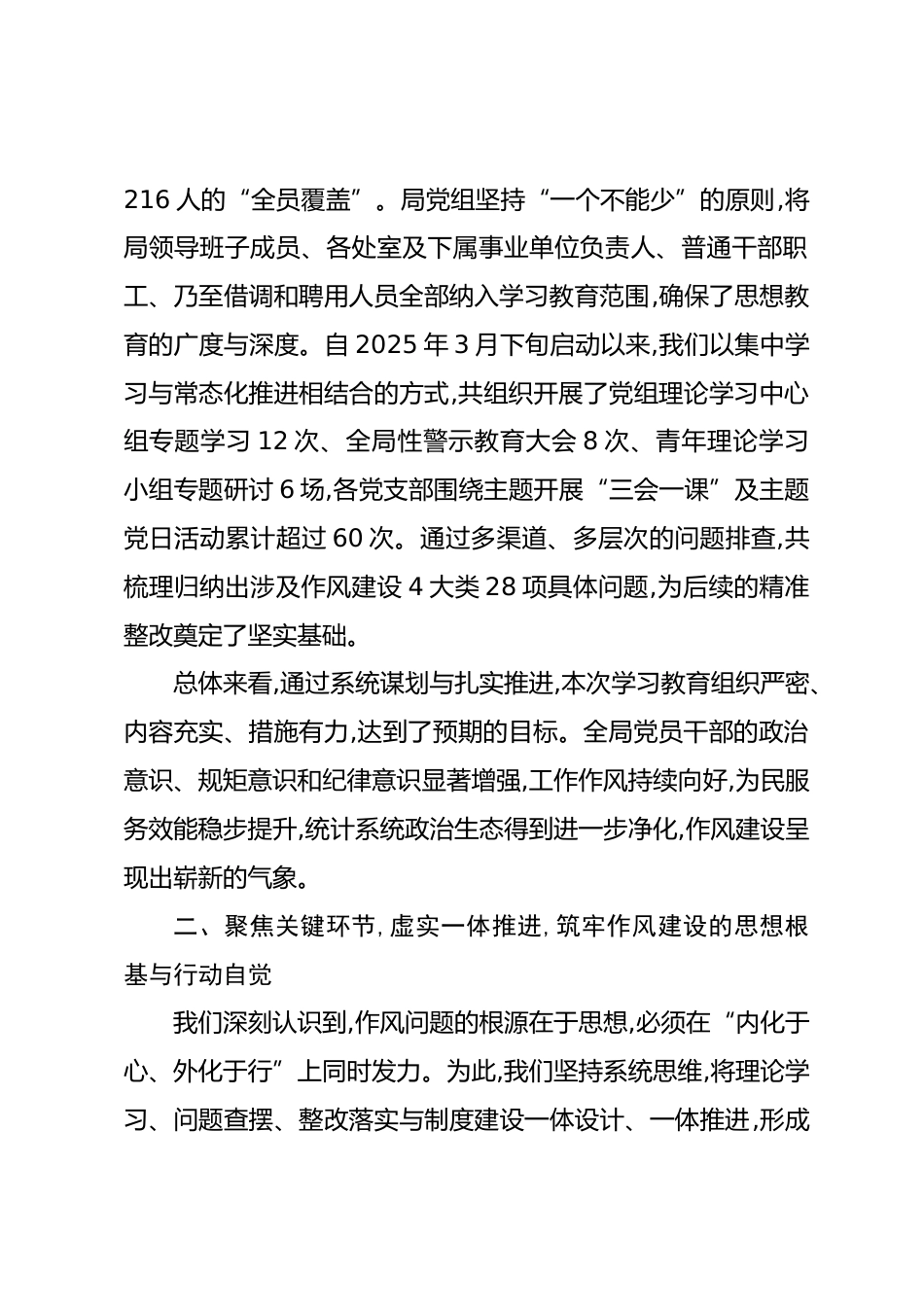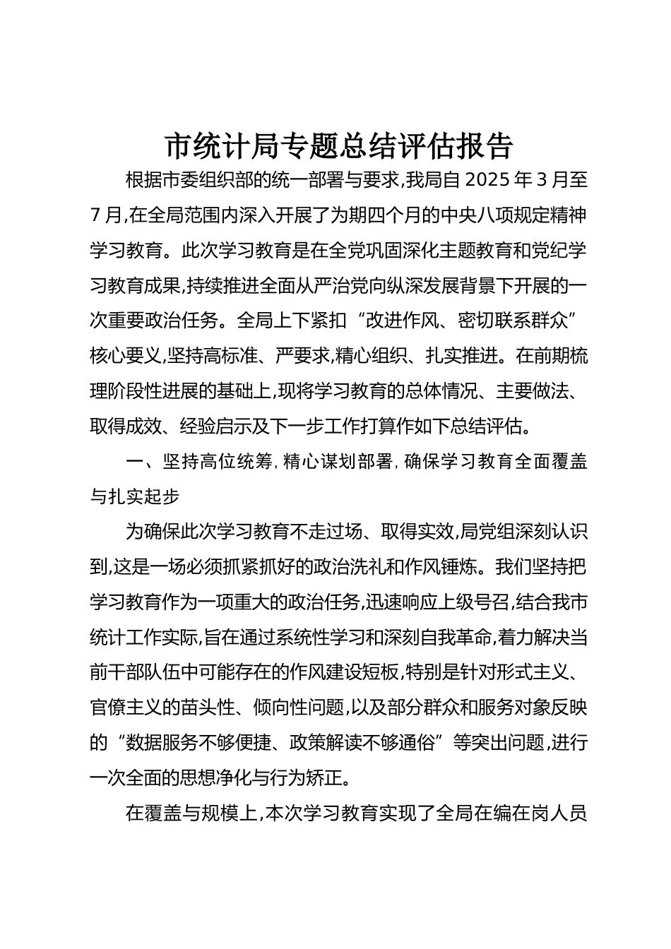 市統(tǒng)計(jì)局專題總結(jié)評(píng)估報(bào)告根據(jù)市委組織部的統(tǒng)一部署與要求,我局自2025年3月至7月,在全局范圍內(nèi)深入開(kāi)展了為期四個(gè)月的中央八項(xiàng)規(guī)定精神學(xué)習(xí)教育。此次學(xué)習(xí)教育是在全黨鞏固深化主題教育和黨紀(jì)學(xué)習(xí)教育成果,持續(xù)推進(jìn)全面從嚴(yán)治黨向縱深發(fā)展背景下開(kāi)展的一次重要政治任務(wù)。全局上下緊扣“改進(jìn)作風(fēng)、密切聯(lián)系群眾”核心要義,堅(jiān)持高標(biāo)準(zhǔn)、嚴(yán)要求,精心組織、扎實(shí)推進(jìn)。在前期梳理階段性進(jìn)展的基礎(chǔ)上,現(xiàn)將學(xué)習(xí)教育的總體情況、主要做法、取得成效、經(jīng)驗(yàn)啟示及下一步工作打算作如下總結(jié)評(píng)估。一、堅(jiān)持高位統(tǒng)籌,精心謀劃部署,確保學(xué)習(xí)教育全面覆蓋與扎實(shí)起步為確保此次學(xué)習(xí)教育不...