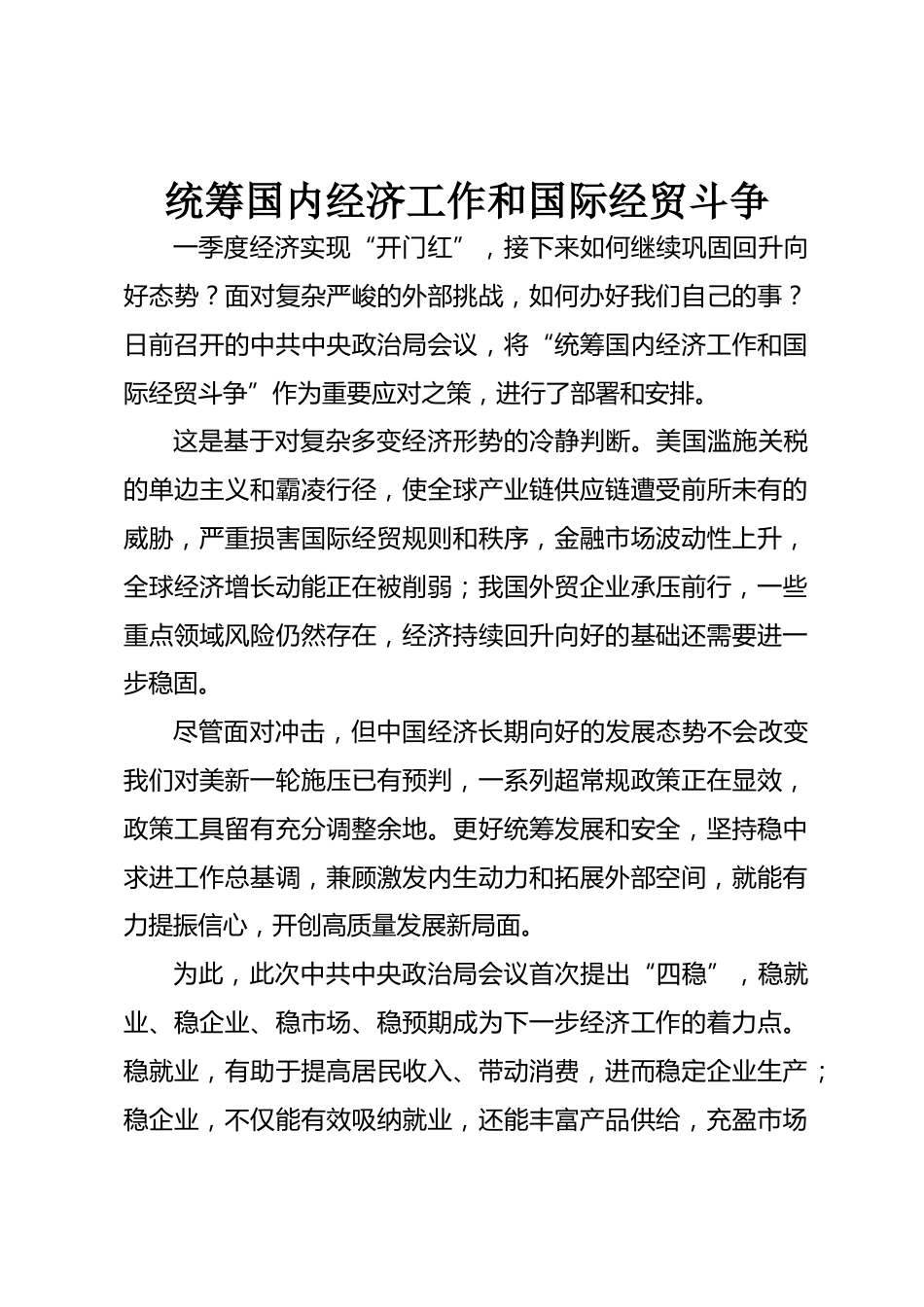 統(tǒng)籌國內(nèi)經(jīng)濟(jì)工作和國際經(jīng)貿(mào)斗爭一季度經(jīng)濟(jì)實現(xiàn)“開門紅”,接下來如何繼續(xù)鞏固回升向好態(tài)勢?面對復(fù)雜嚴(yán)峻的外部挑戰(zhàn),如何辦好我們自己的事?日前召開的中共中央政治局會議,將“統(tǒng)籌國內(nèi)經(jīng)濟(jì)工作和國際經(jīng)貿(mào)斗爭”作為重要應(yīng)對之策,進(jìn)行了部署和安排。這是基于對復(fù)雜多變經(jīng)濟(jì)形勢的冷靜判斷。美國濫施關(guān)稅的單邊主義和霸凌行徑,使全球產(chǎn)業(yè)鏈供應(yīng)鏈遭受前所未有的威脅,嚴(yán)重?fù)p害國際經(jīng)貿(mào)規(guī)則和秩序,金融市場波動性上升,全球經(jīng)濟(jì)增長動能正在被削弱;我國外貿(mào)企業(yè)承壓前行,一些重點領(lǐng)域風(fēng)險仍然存在,經(jīng)濟(jì)持續(xù)回升向好的基礎(chǔ)還需要進(jìn)一步穩(wěn)固。盡管面對沖擊,但中國...