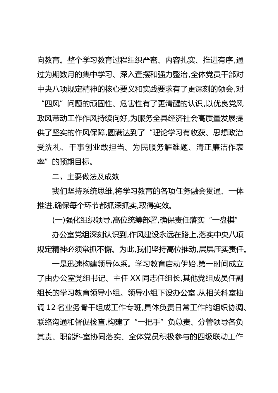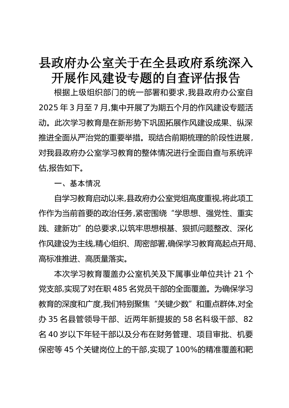 縣政府辦公室關(guān)于在全縣政府系統(tǒng)深入開展作風(fēng)建設(shè)專題的自查評(píng)估報(bào)告根據(jù)上級(jí)組織部門的統(tǒng)一部署和要求,我縣政府辦公室自2025年3月至7月,集中開展了為期五個(gè)月的作風(fēng)建設(shè)專題活動(dòng)。此次學(xué)習(xí)教育是在新形勢(shì)下鞏固拓展作風(fēng)建設(shè)成果、縱深推進(jìn)全面從嚴(yán)治黨的重要舉措?,F(xiàn)結(jié)合前期梳理的階段性進(jìn)展,對(duì)我縣政府辦公室學(xué)習(xí)教育的整體情況進(jìn)行全面自查與系統(tǒng)評(píng)估,報(bào)告如下。一、基本情況自學(xué)習(xí)教育啟動(dòng)以來,縣政府辦公室黨組高度重視,將此項(xiàng)工作作為當(dāng)前首要的政治任務(wù),緊密圍繞“學(xué)思想、強(qiáng)黨性、重實(shí)踐、建新功”的總要求,以筑牢思想根基、狠抓問題整改、深化作風(fēng)建設(shè)為主線,...