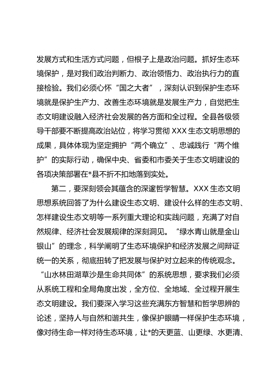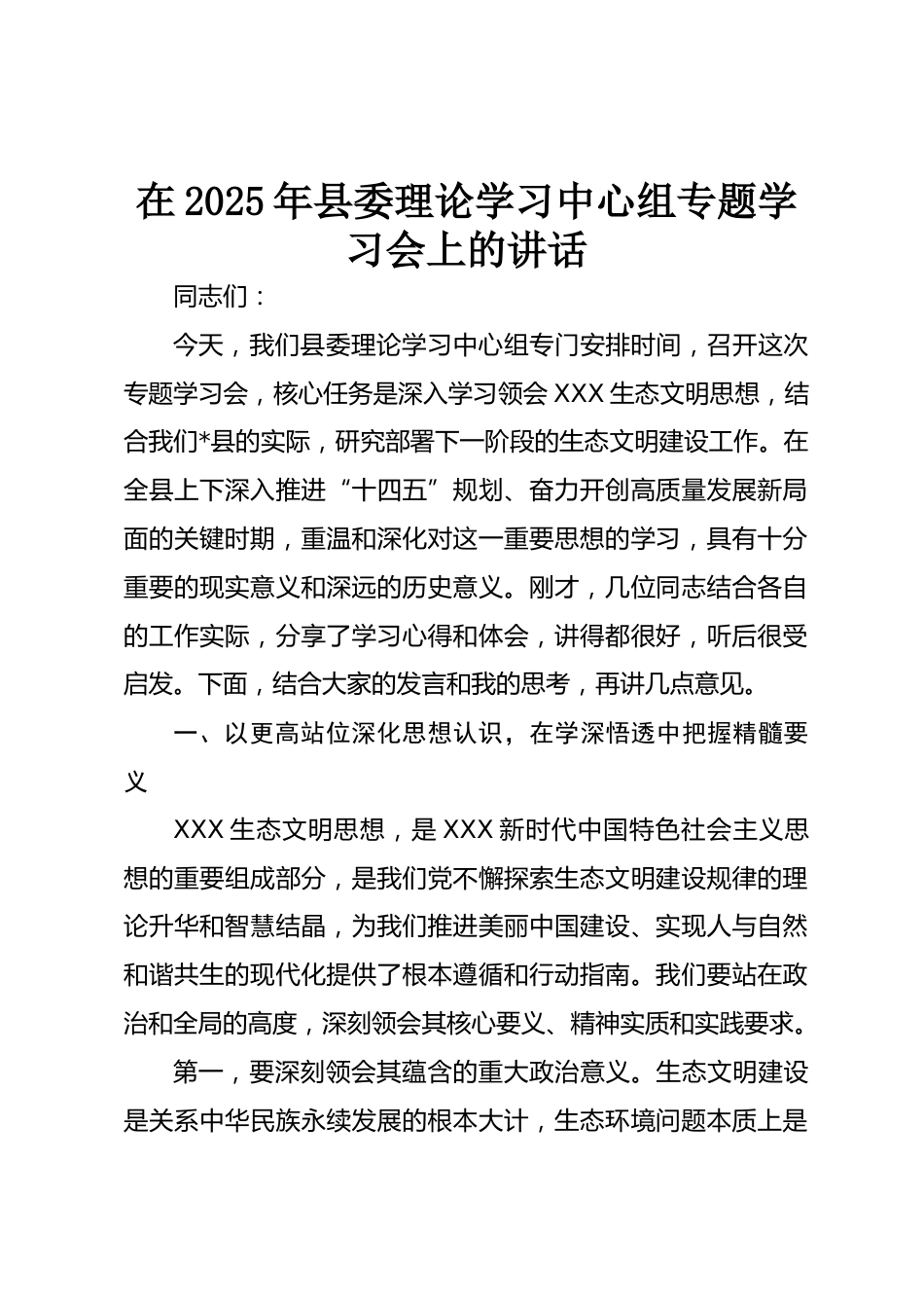 在2025年縣委理論學(xué)習(xí)中心組專題學(xué)習(xí)會(huì)上的講話同志們:今天,我們縣委理論學(xué)習(xí)中心組專門安排時(shí)間,召開這次專題學(xué)習(xí)會(huì),核心任務(wù)是深入學(xué)習(xí)領(lǐng)會(huì)XXX生態(tài)文明思想,結(jié)合我們*縣的實(shí)際,研究部署下一階段的生態(tài)文明建設(shè)工作。在全縣上下深入推進(jìn)“十四五”規(guī)劃、奮力開創(chuàng)高質(zhì)量發(fā)展新局面的關(guān)鍵時(shí)期,重溫和深化對(duì)這一重要思想的學(xué)習(xí),具有十分重要的現(xiàn)實(shí)意義和深遠(yuǎn)的歷史意義。剛才,幾位同志結(jié)合各自的工作實(shí)際,分享了學(xué)習(xí)心得和體會(huì),講得都很好,聽后很受啟發(fā)。下面,結(jié)合大家的發(fā)言和我的思考,再講幾點(diǎn)意見。一、以更高站位深化思想認(rèn)識(shí),在學(xué)深悟透中把握精髓要義...