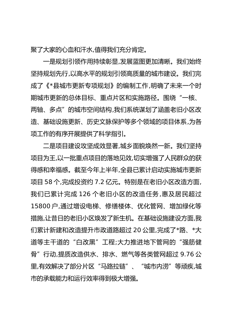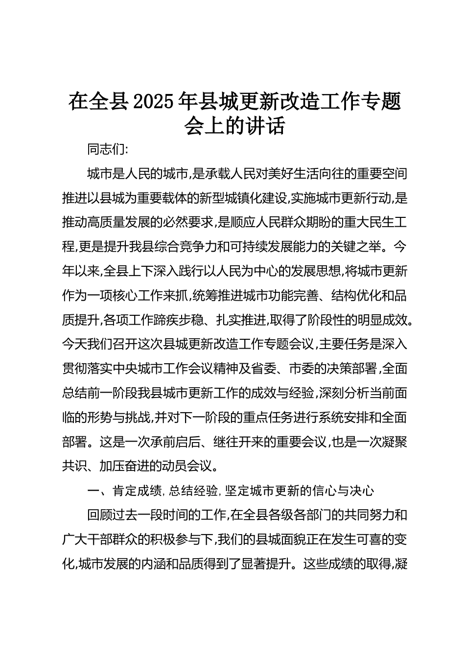 在全縣2025年縣城更新改造工作專題會上的講話同志們:城市是人民的城市,是承載人民對美好生活向往的重要空間推進以縣城為重要載體的新型城鎮(zhèn)化建設(shè),實施城市更新行動,是推動高質(zhì)量發(fā)展的必然要求,是順應(yīng)人民群眾期盼的重大民生工程,更是提升我縣綜合競爭力和可持續(xù)發(fā)展能力的關(guān)鍵之舉。今年以來,全縣上下深入踐行以人民為中心的發(fā)展思想,將城市更新作為一項核心工作來抓,統(tǒng)籌推進城市功能完善、結(jié)構(gòu)優(yōu)化和品質(zhì)提升,各項工作蹄疾步穩(wěn)、扎實推進,取得了階段性的明顯成效。今天我們召開這次縣城更新改造工作專題會議,主要任務(wù)是深入貫徹落實中央城市工作會議精神及省委、市委...