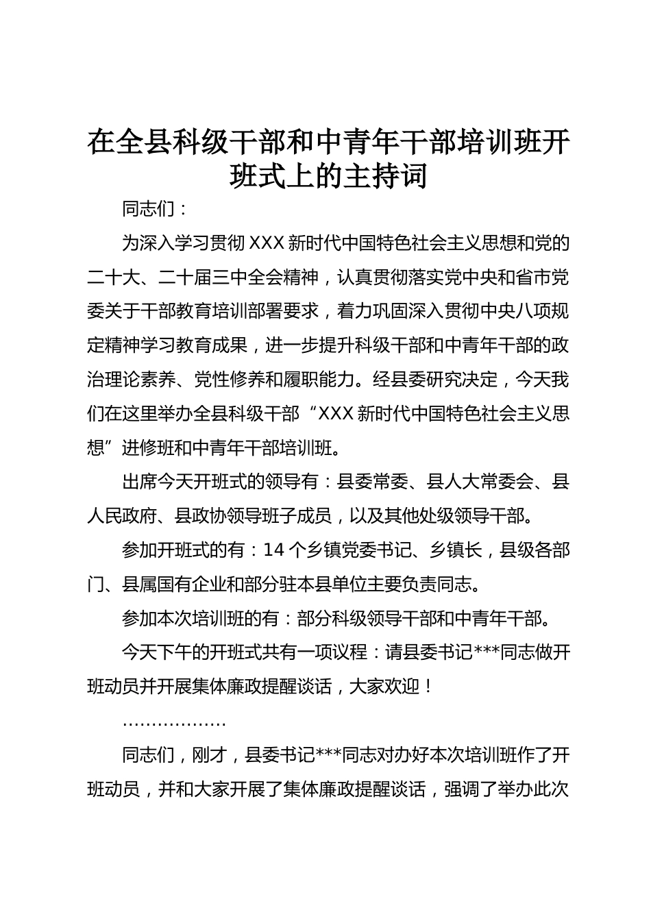 在全縣科級(jí)干部和中青年干部培訓(xùn)班開班式上的主持詞同志們:為深入學(xué)習(xí)貫徹XXX新時(shí)代中國(guó)特色社會(huì)主義思想和黨的二十大、二十屆三中全會(huì)精神,認(rèn)真貫徹落實(shí)黨中央和省市黨委關(guān)于干部教育培訓(xùn)部署要求,著力鞏固深入貫徹中央八項(xiàng)規(guī)定精神學(xué)習(xí)教育成果,進(jìn)一步提升科級(jí)干部和中青年干部的政治理論素養(yǎng)、黨性修養(yǎng)和履職能力。經(jīng)縣委研究決定,今天我們?cè)谶@里舉辦全縣科級(jí)干部“XXX新時(shí)代中國(guó)特色社會(huì)主義思想”進(jìn)修班和中青年干部培訓(xùn)班。出席今天開班式的領(lǐng)導(dǎo)有:縣委常委、縣人大常委會(huì)、縣人民政府、縣政協(xié)領(lǐng)導(dǎo)班子成員,以及其他處級(jí)領(lǐng)導(dǎo)干部。參加開班式的有:14個(gè)鄉(xiāng)鎮(zhèn)...