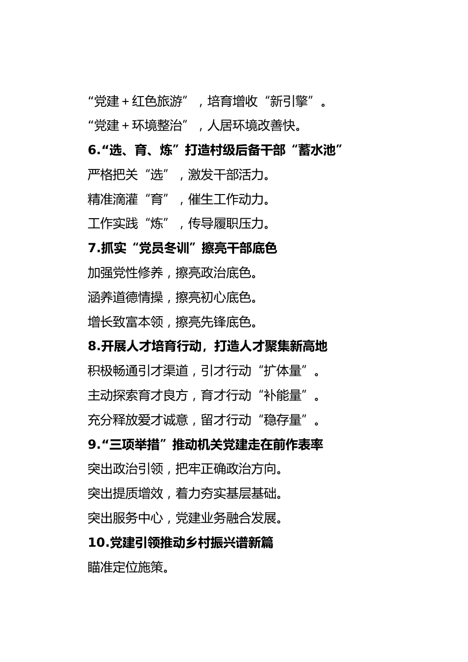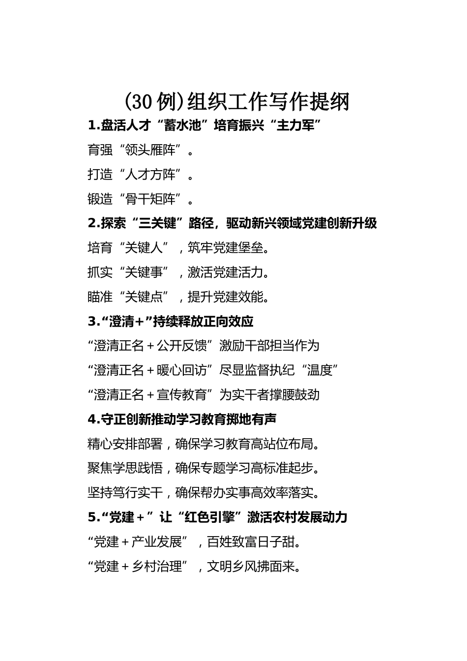 (30例)組織工作寫(xiě)作提綱1.盤(pán)活人才“蓄水池”培育振興“主力軍”育強(qiáng)“領(lǐng)頭雁陣”。打造“人才方陣”。鍛造“骨干矩陣”。2.探索“三關(guān)鍵”路徑,驅(qū)動(dòng)新興領(lǐng)域黨建創(chuàng)新升級(jí)培育“關(guān)鍵人”,筑牢黨建堡壘。抓實(shí)“關(guān)鍵事”,激活黨建活力。瞄準(zhǔn)“關(guān)鍵點(diǎn)”,提升黨建效能。3.“澄清+”持續(xù)釋放正向效應(yīng)“澄清正名+公開(kāi)反饋”激勵(lì)干部擔(dān)當(dāng)作為“澄清正名+暖心回訪”盡顯監(jiān)督執(zhí)紀(jì)“溫度”“澄清正名+宣傳教育”為實(shí)干者撐腰鼓勁4.守正創(chuàng)新推動(dòng)學(xué)習(xí)教育擲地有聲精心安排部署,確保學(xué)習(xí)教育高站位布局。聚焦學(xué)思踐悟,確保專題學(xué)習(xí)高標(biāo)準(zhǔn)起步。堅(jiān)持篤行實(shí)干,確保幫辦實(shí)事高...