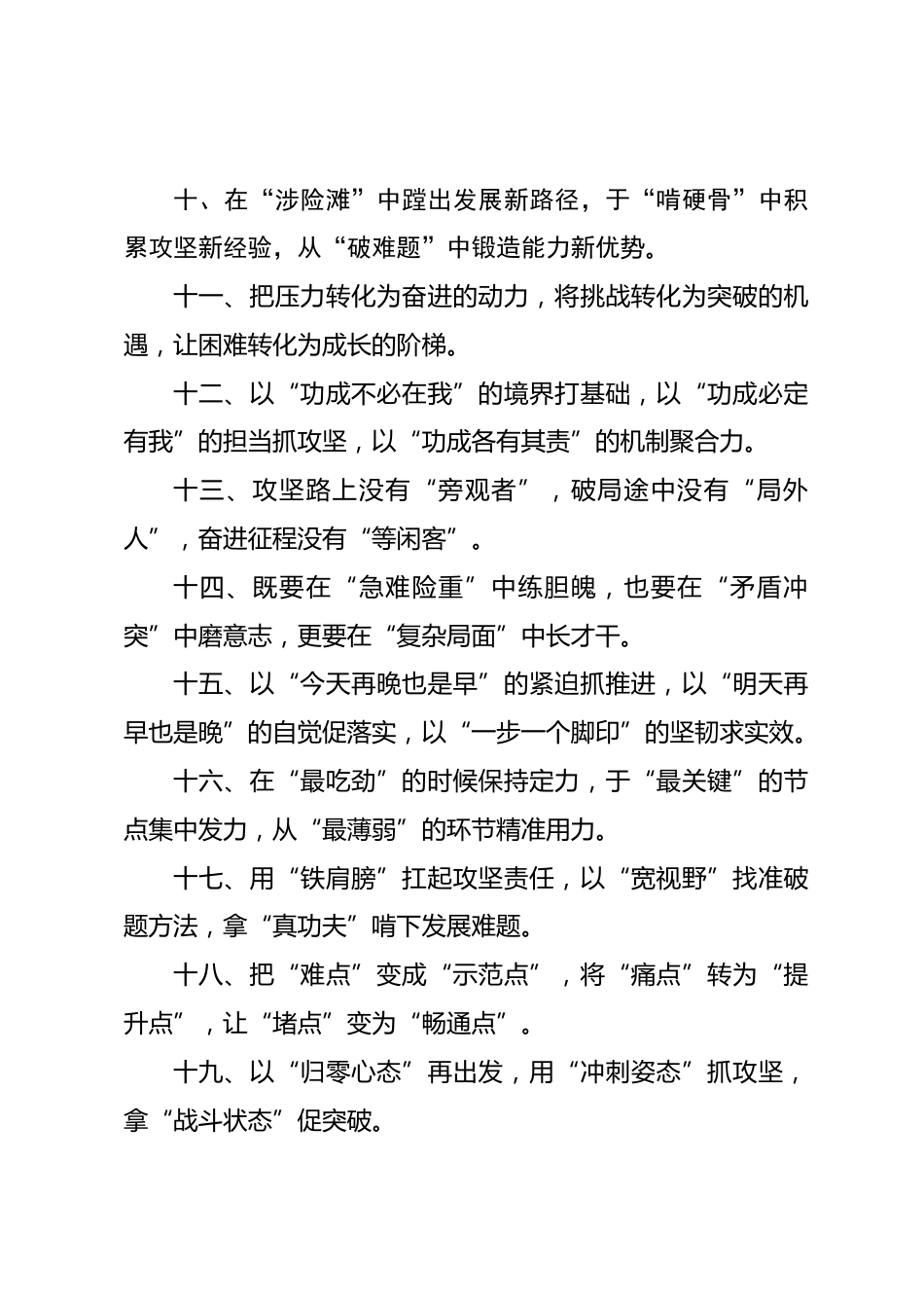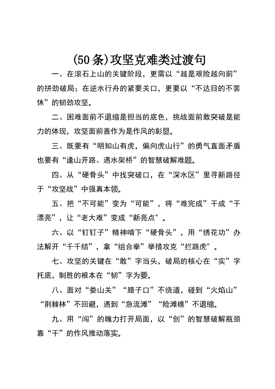 (50條)攻堅(jiān)克難類過渡句一、在滾石上山的關(guān)鍵階段,更需以“越是艱險(xiǎn)越向前”的拼勁破局;在逆水行舟的緊要關(guān)口,更要以“不達(dá)目的不罷休”的韌勁攻堅(jiān)。二、困難面前不退縮是擔(dān)當(dāng)?shù)牡咨?,挑?zhàn)面前敢突破是能力的體現(xiàn),攻堅(jiān)面前善作為是作風(fēng)的彰顯。三、既要有“明知山有虎,偏向虎山行”的勇氣直面矛盾也要有“逢山開路、遇水架橋”的智慧破解難題。四、從“硬骨頭”中找突破口,在“深水區(qū)”里尋新路徑于“攻堅(jiān)戰(zhàn)”中強(qiáng)真本領(lǐng)。五、把“不可能”變?yōu)椤翱赡堋?,將“難完成”干成“干漂亮”,讓“老大難”變成“新亮點(diǎn)”。六、以“釘釘子”精神啃下“硬骨頭”,用“繡花功...