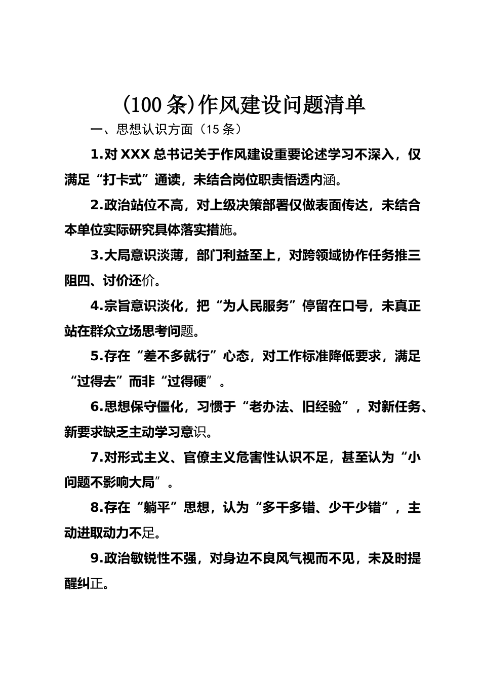 (100條)作風(fēng)建設(shè)問題清單一、思想認(rèn)識(shí)方面(15條)1.對(duì)XXX總書記關(guān)于作風(fēng)建設(shè)重要論述學(xué)習(xí)不深入,僅滿足“打卡式”通讀,未結(jié)合崗位職責(zé)悟透內(nèi)涵。2.政治站位不高,對(duì)上級(jí)決策部署僅做表面?zhèn)鬟_(dá),未結(jié)合本單位實(shí)際研究具體落實(shí)措施。3.大局意識(shí)淡薄,部門利益至上,對(duì)跨領(lǐng)域協(xié)作任務(wù)推三阻四、討價(jià)還價(jià)。4.宗旨意識(shí)淡化,把“為人民服務(wù)”停留在口號(hào),未真正站在群眾立場(chǎng)思考問題。5.存在“差不多就行”心態(tài),對(duì)工作標(biāo)準(zhǔn)降低要求,滿足“過得去”而非“過得硬”。6.思想保守僵化,習(xí)慣于“老辦法、舊經(jīng)驗(yàn)”,對(duì)新任務(wù)、新要求缺乏主動(dòng)學(xué)習(xí)意識(shí)。7.對(duì)形式主義、官僚主義危...