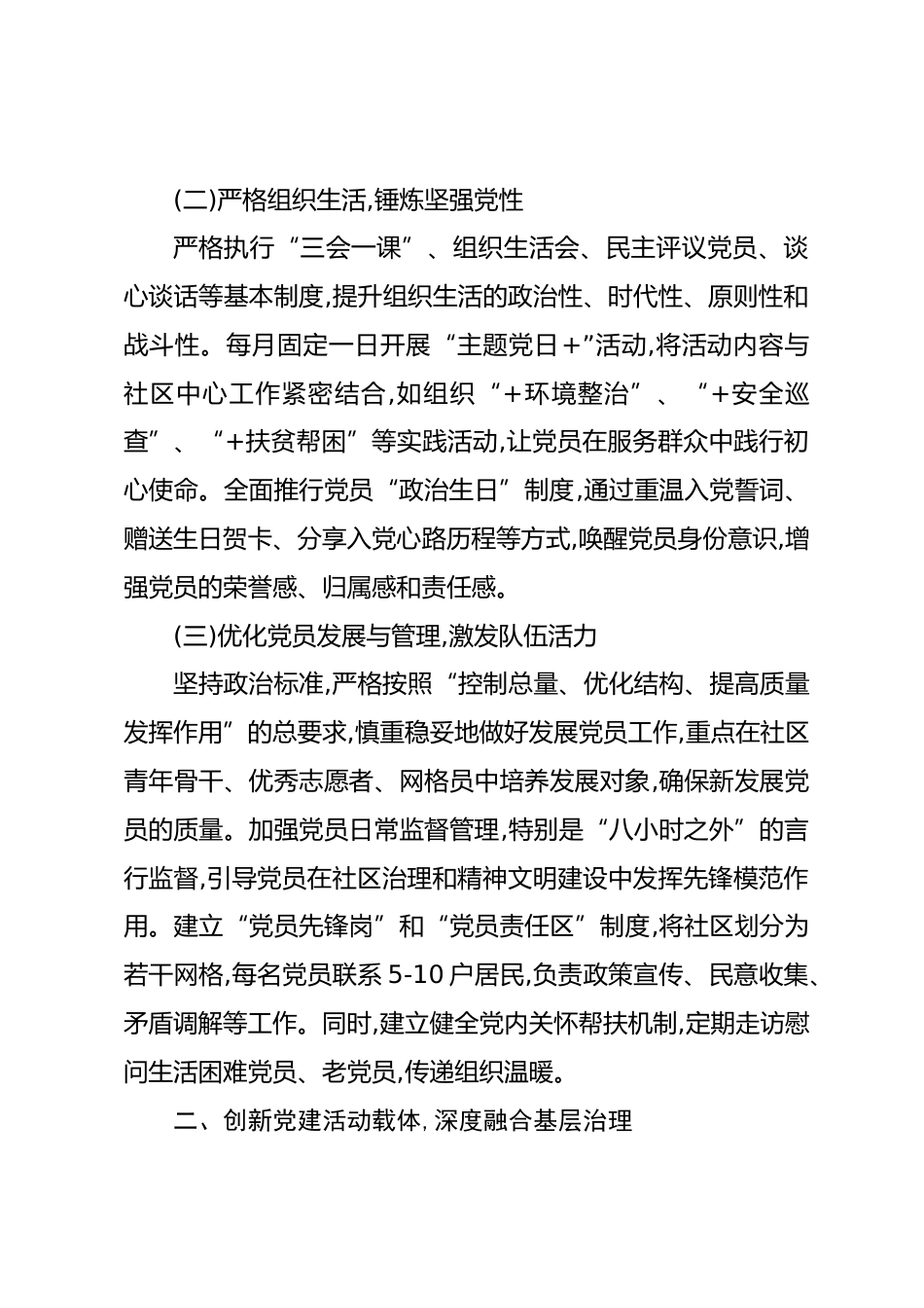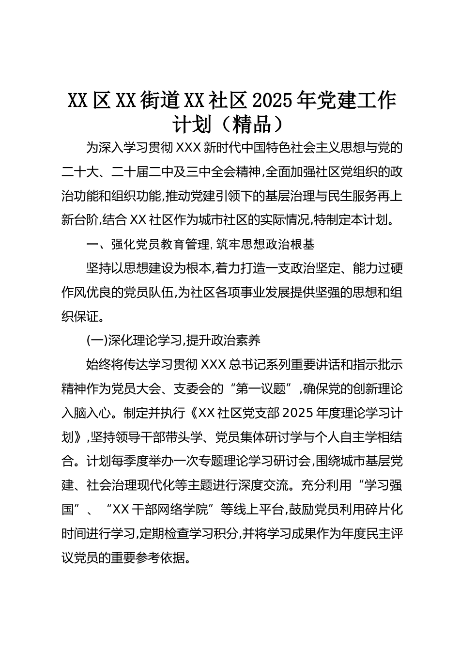 XX區(qū)XX街道XX社區(qū)2025年黨建工作計(jì)劃(精品)為深入學(xué)習(xí)貫徹XXX新時(shí)代中國特色社會(huì)主義思想與黨的二十大、二十屆二中及三中全會(huì)精神,全面加強(qiáng)社區(qū)黨組織的政治功能和組織功能,推動(dòng)黨建引領(lǐng)下的基層治理與民生服務(wù)再上新臺(tái)階,結(jié)合XX社區(qū)作為城市社區(qū)的實(shí)際情況,特制定本計(jì)劃。一、強(qiáng)化黨員教育管理,筑牢思想政治根基堅(jiān)持以思想建設(shè)為根本,著力打造一支政治堅(jiān)定、能力過硬作風(fēng)優(yōu)良的黨員隊(duì)伍,為社區(qū)各項(xiàng)事業(yè)發(fā)展提供堅(jiān)強(qiáng)的思想和組織保證。(一)深化理論學(xué)習(xí),提升政治素養(yǎng)始終將傳達(dá)學(xué)習(xí)貫徹XXX總書記系列重要講話和指示批示精神作為黨員大會(huì)、支委會(huì)的“第一議題”,確保黨...