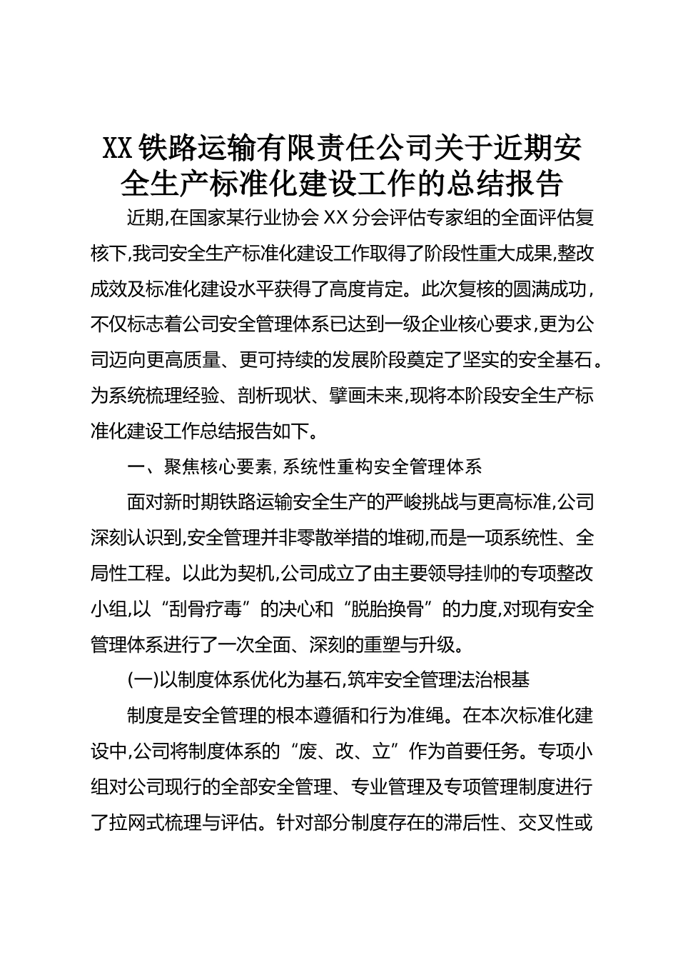 XX鐵路運(yùn)輸有限責(zé)任公司關(guān)于近期安全生產(chǎn)標(biāo)準(zhǔn)化建設(shè)工作的總結(jié)報(bào)告近期,在國家某行業(yè)協(xié)會XX分會評估專家組的全面評估復(fù)核下,我司安全生產(chǎn)標(biāo)準(zhǔn)化建設(shè)工作取得了階段性重大成果,整改成效及標(biāo)準(zhǔn)化建設(shè)水平獲得了高度肯定。此次復(fù)核的圓滿成功,不僅標(biāo)志著公司安全管理體系已達(dá)到一級企業(yè)核心要求,更為公司邁向更高質(zhì)量、更可持續(xù)的發(fā)展階段奠定了堅(jiān)實(shí)的安全基石。為系統(tǒng)梳理經(jīng)驗(yàn)、剖析現(xiàn)狀、擘畫未來,現(xiàn)將本階段安全生產(chǎn)標(biāo)準(zhǔn)化建設(shè)工作總結(jié)報(bào)告如下。一、聚焦核心要素,系統(tǒng)性重構(gòu)安全管理體系面對新時(shí)期鐵路運(yùn)輸安全生產(chǎn)的嚴(yán)峻挑戰(zhàn)與更高標(biāo)準(zhǔn),公司深刻認(rèn)識到,安全管理并非零...