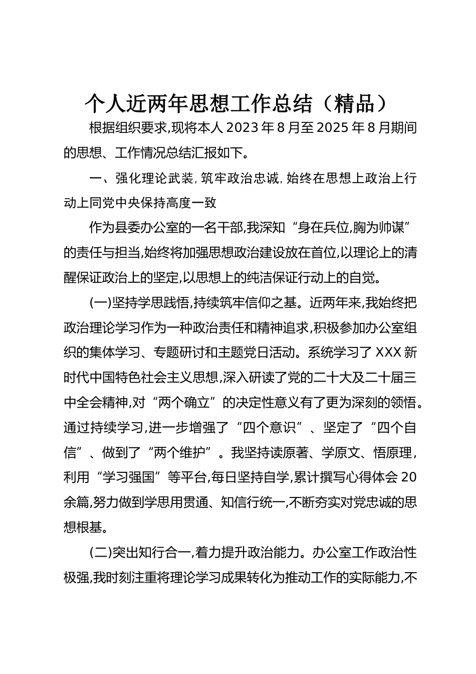 個(gè)人近兩年思想工作總結(jié)(精品)根據(jù)組織要求,現(xiàn)將本人2023年8月至2025年8月期間的思想、工作情況總結(jié)匯報(bào)如下。一、強(qiáng)化理論武裝,筑牢政治忠誠(chéng),始終在思想上政治上行動(dòng)上同黨中央保持高度一致作為縣委辦公室的一名干部,我深知“身在兵位,胸為帥謀”的責(zé)任與擔(dān)當(dāng),始終將加強(qiáng)思想政治建設(shè)放在首位,以理論上的清醒保證政治上的堅(jiān)定,以思想上的純潔保證行動(dòng)上的自覺。(一)堅(jiān)持學(xué)思踐悟,持續(xù)筑牢信仰之基。近兩年來,我始終把政治理論學(xué)習(xí)作為一種政治責(zé)任和精神追求,積極參加辦公室組織的集體學(xué)習(xí)、專題研討和主題黨日活動(dòng)。系統(tǒng)學(xué)習(xí)了XXX新時(shí)代中國(guó)特色社會(huì)主義思想,深入研...