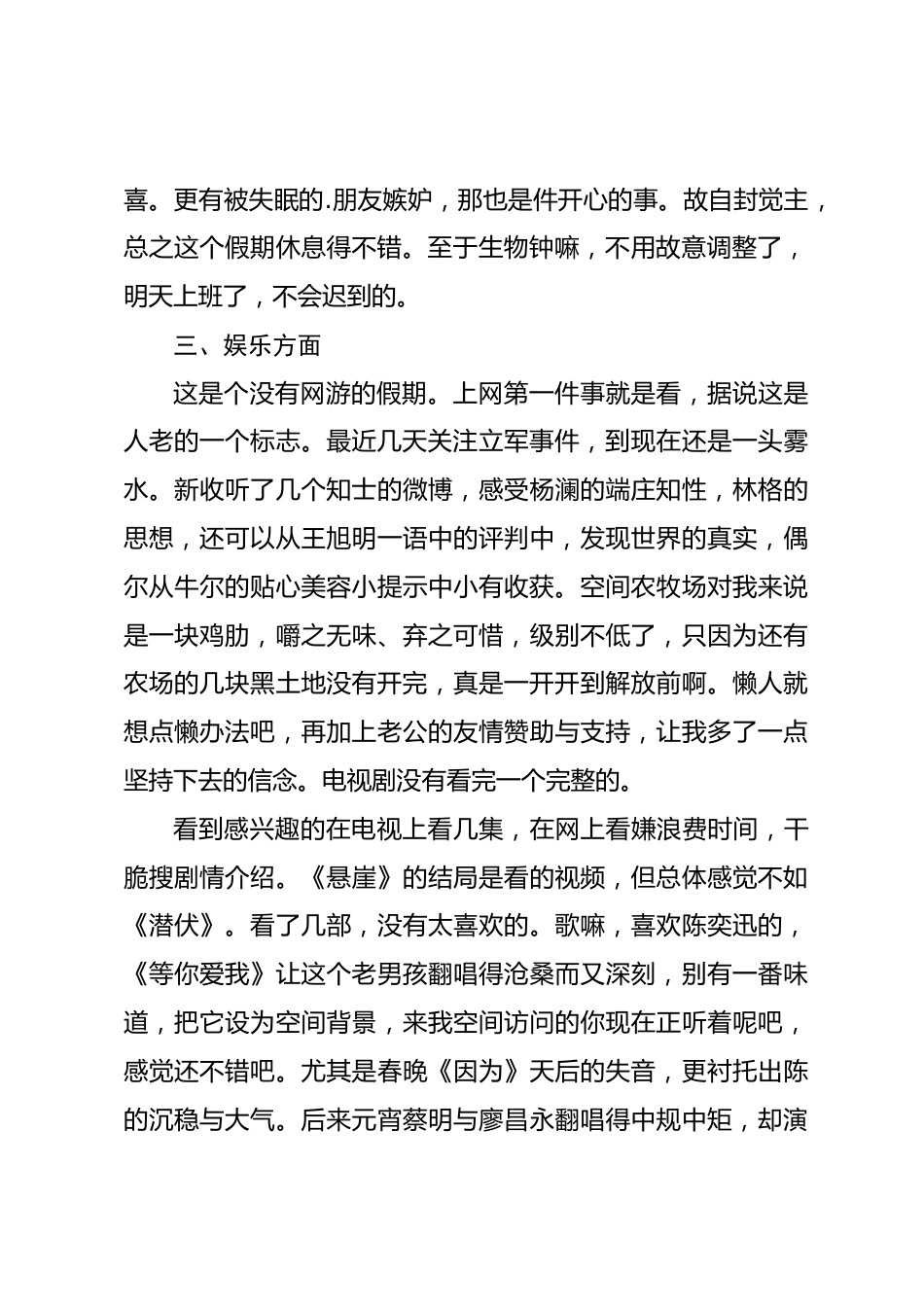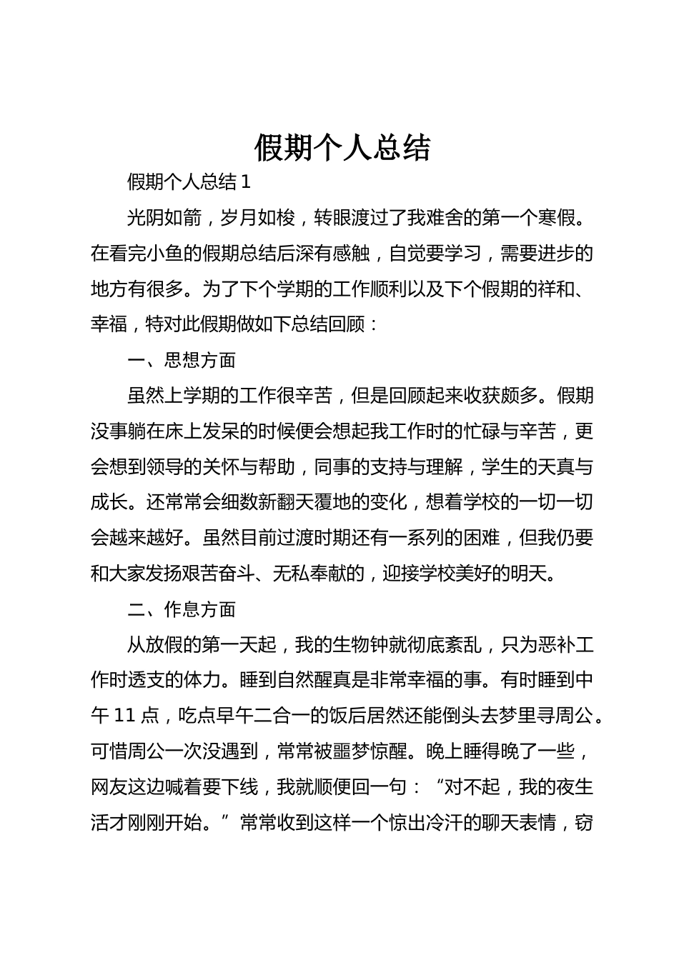 假期個人總結假期個人總結1光陰如箭,歲月如梭,轉(zhuǎn)眼渡過了我難舍的第一個寒假。在看完小魚的假期總結后深有感觸,自覺要學習,需要進步的地方有很多。為了下個學期的工作順利以及下個假期的祥和、幸福,特對此假期做如下總結回顧:一、思想方面雖然上學期的工作很辛苦,但是回顧起來收獲頗多。假期沒事躺在床上發(fā)呆的時候便會想起我工作時的忙碌與辛苦,更會想到領導的關懷與幫助,同事的支持與理解,學生的天真與成長。還常常會細數(shù)新翻天覆地的變化,想著學校的一切一切會越來越好。雖然目前過渡時期還有一系列的困難,但我仍要和大家發(fā)揚艱苦奮斗、無私奉獻的,迎接...