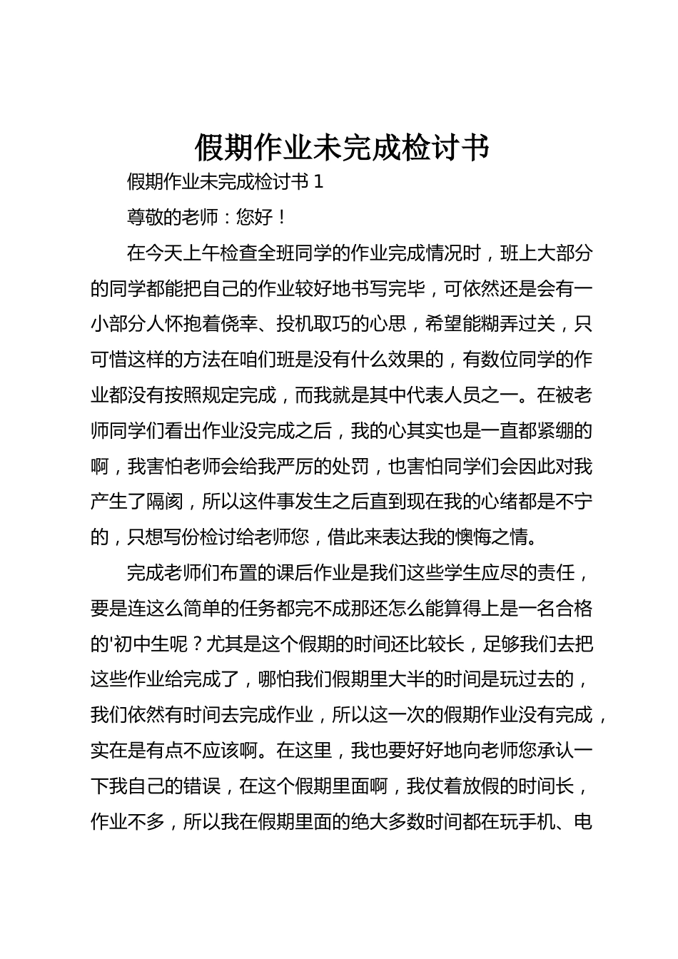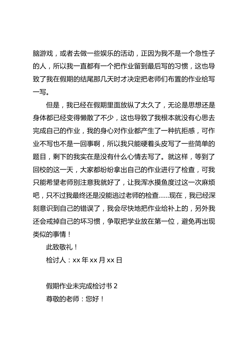 假期作業(yè)未完成檢討書假期作業(yè)未完成檢討書1尊敬的老師:您好!在今天上午檢查全班同學(xué)的作業(yè)完成情況時(shí),班上大部分的同學(xué)都能把自己的作業(yè)較好地書寫完畢,可依然還是會(huì)有一小部分人懷抱著僥幸、投機(jī)取巧的心思,希望能糊弄過(guò)關(guān),只可惜這樣的方法在咱們班是沒有什么效果的,有數(shù)位同學(xué)的作業(yè)都沒有按照規(guī)定完成,而我就是其中代表人員之一。在被老師同學(xué)們看出作業(yè)沒完成之后,我的心其實(shí)也是一直都緊繃的啊,我害怕老師會(huì)給我嚴(yán)厲的處罰,也害怕同學(xué)們會(huì)因此對(duì)我產(chǎn)生了隔閡,所以這件事發(fā)生之后直到現(xiàn)在我的心緒都是不寧的,只想寫份檢討給老師您,借此來(lái)表達(dá)我的懊...