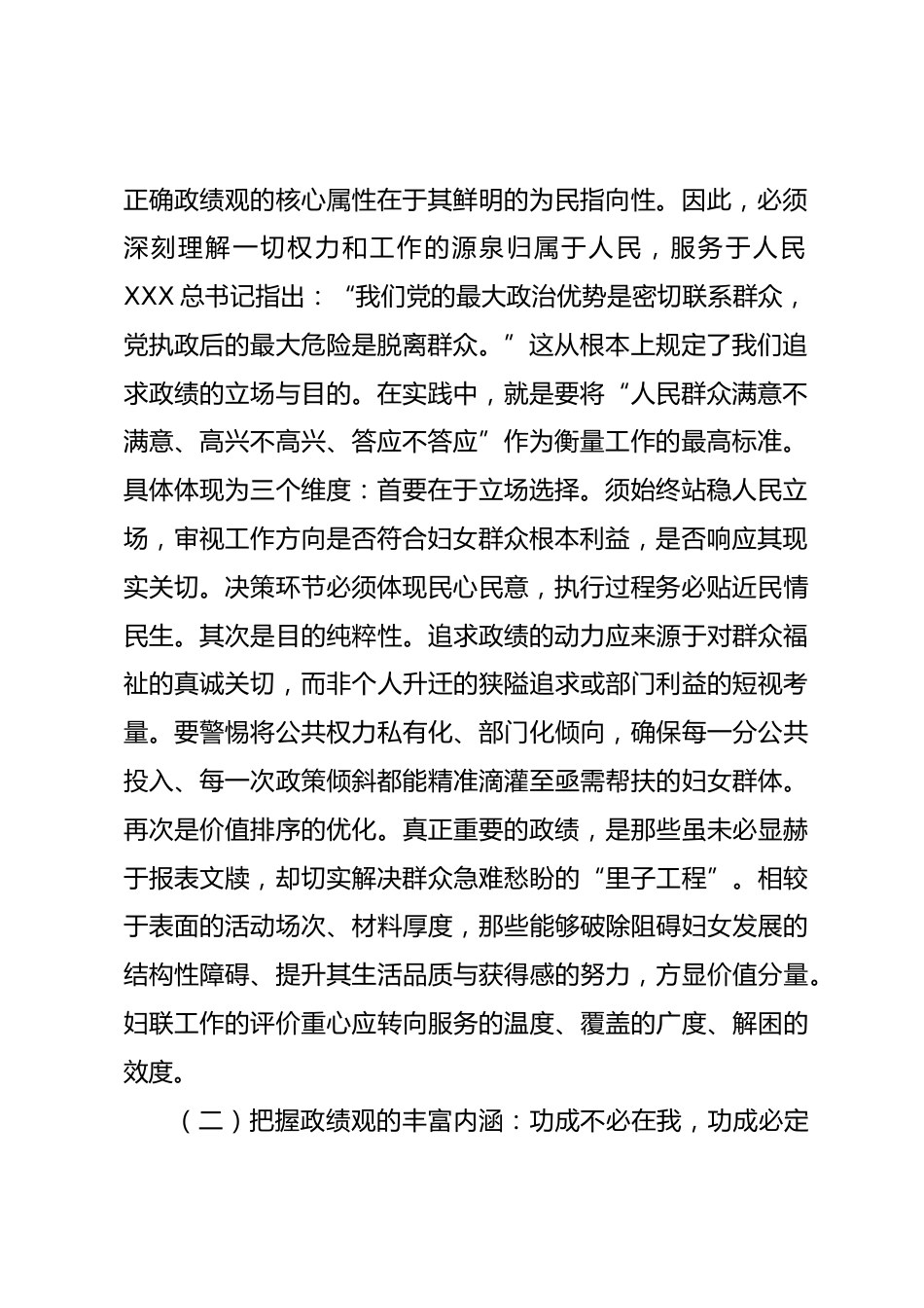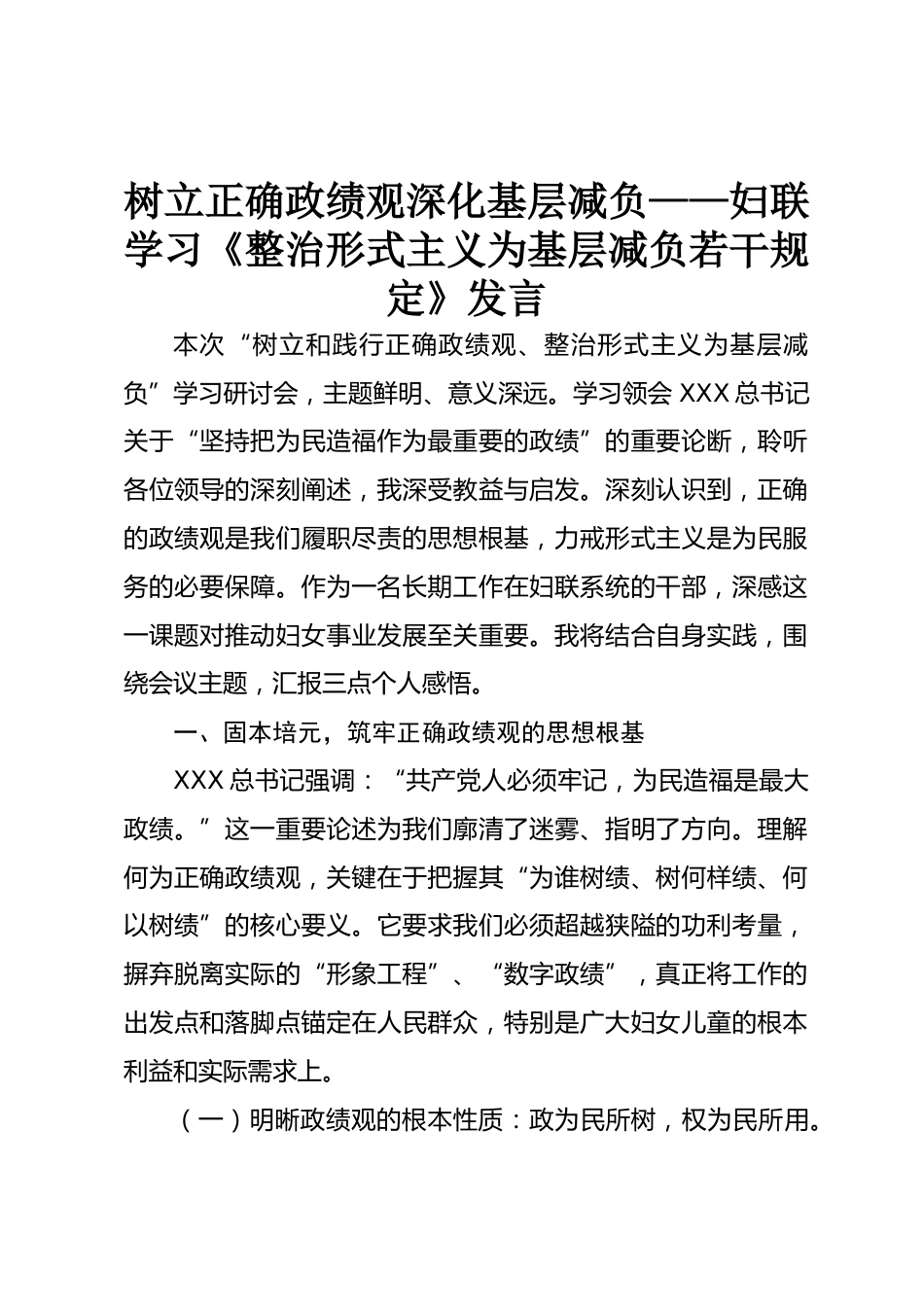 樹立正確政績(jī)觀深化基層減負(fù)——婦聯(lián)學(xué)習(xí)《整治形式主義為基層減負(fù)若干規(guī)定》發(fā)言本次“樹立和踐行正確政績(jī)觀、整治形式主義為基層減負(fù)”學(xué)習(xí)研討會(huì),主題鮮明、意義深遠(yuǎn)。學(xué)習(xí)領(lǐng)會(huì)XXX總書記關(guān)于“堅(jiān)持把為民造福作為最重要的政績(jī)”的重要論斷,聆聽各位領(lǐng)導(dǎo)的深刻闡述,我深受教益與啟發(fā)。深刻認(rèn)識(shí)到,正確的政績(jī)觀是我們履職盡責(zé)的思想根基,力戒形式主義是為民服務(wù)的必要保障。作為一名長(zhǎng)期工作在婦聯(lián)系統(tǒng)的干部,深感這一課題對(duì)推動(dòng)?jì)D女事業(yè)發(fā)展至關(guān)重要。我將結(jié)合自身實(shí)踐,圍繞會(huì)議主題,匯報(bào)三點(diǎn)個(gè)人感悟。一、固本培元,筑牢正確政績(jī)觀的思想根基XXX總書記強(qiáng)調(diào):...