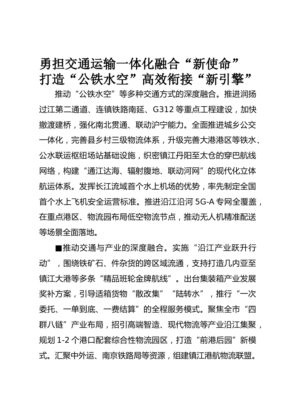 勇?lián)煌ㄟ\(yùn)輸一體化融合“新使命”打造“公鐵水空”高效銜接“新引擎”推動(dòng)“公鐵水空”等多種交通方式的深度融合。推進(jìn)潤(rùn)揚(yáng)過(guò)江第二通道、連鎮(zhèn)鐵路南延、G312等重點(diǎn)工程建設(shè),加快撤渡建橋,強(qiáng)化南北貫通、聯(lián)動(dòng)滬寧能力。全面推進(jìn)城鄉(xiāng)公交一體化,完善縣鄉(xiāng)村三級(jí)物流體系,升級(jí)完善大港港區(qū)等鐵水、公水聯(lián)運(yùn)樞紐場(chǎng)站基礎(chǔ)設(shè)施,織密鎮(zhèn)江丹陽(yáng)至太倉(cāng)的穿巴航線網(wǎng)絡(luò),構(gòu)建“通江達(dá)海、輻射腹地、聯(lián)動(dòng)河網(wǎng)”的現(xiàn)代化立體航運(yùn)體系。發(fā)揮長(zhǎng)江流域首個(gè)水上機(jī)場(chǎng)的優(yōu)勢(shì),率先制定全國(guó)首個(gè)水上飛機(jī)安全運(yùn)營(yíng)標(biāo)準(zhǔn)。推進(jìn)沿江沿河5G-A專(zhuān)網(wǎng)全覆蓋,在重點(diǎn)港區(qū)、物流園布局低空物流節(jié)點(diǎn),...