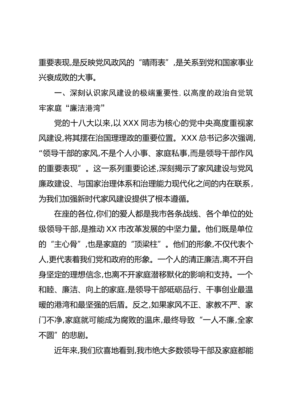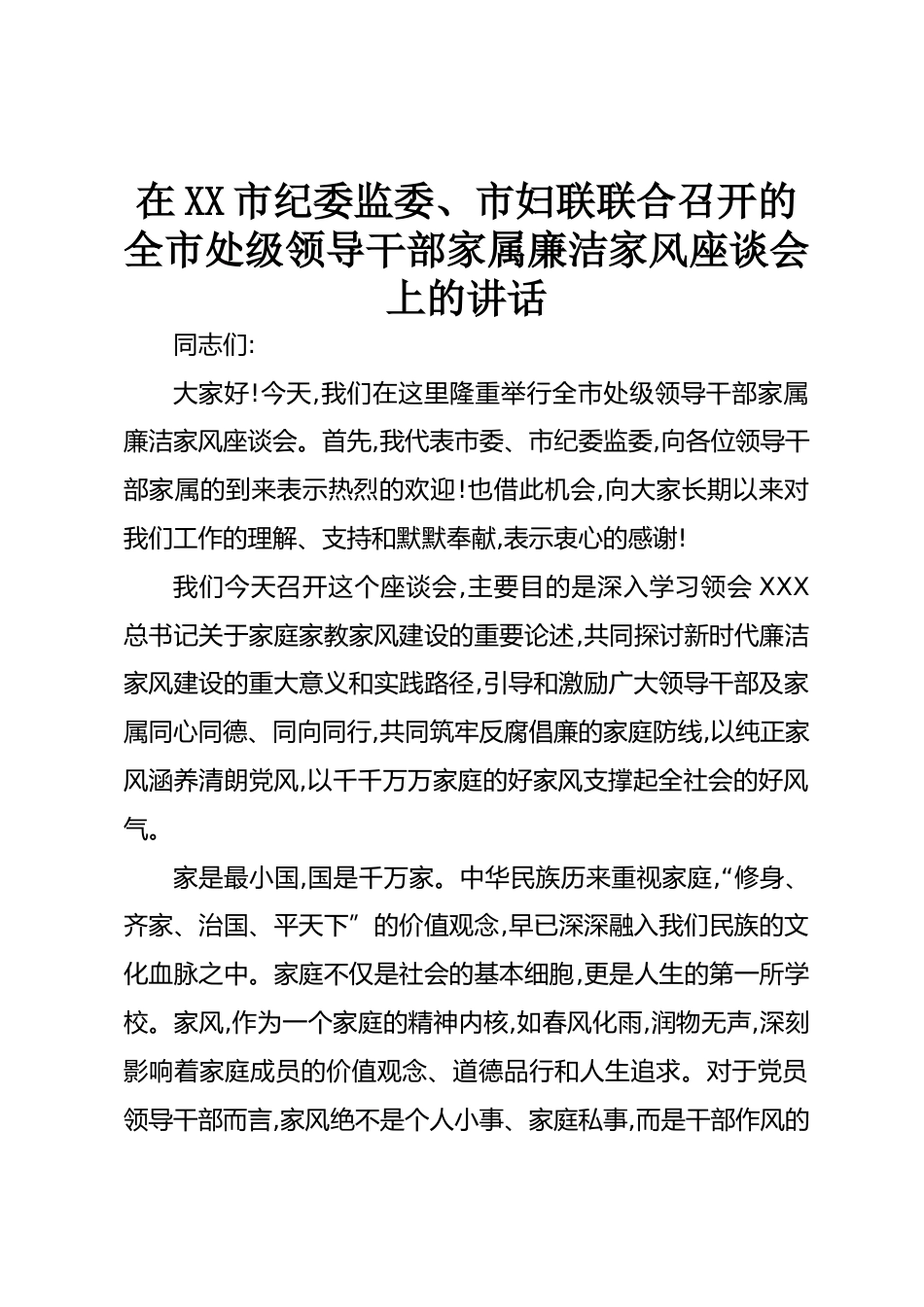 在XX市紀(jì)委監(jiān)委、市婦聯(lián)聯(lián)合召開的全市處級領(lǐng)導(dǎo)干部家屬廉潔家風(fēng)座談會上的講話同志們:大家好!今天,我們在這里隆重舉行全市處級領(lǐng)導(dǎo)干部家屬廉潔家風(fēng)座談會。首先,我代表市委、市紀(jì)委監(jiān)委,向各位領(lǐng)導(dǎo)干部家屬的到來表示熱烈的歡迎!也借此機(jī)會,向大家長期以來對我們工作的理解、支持和默默奉獻(xiàn),表示衷心的感謝!我們今天召開這個座談會,主要目的是深入學(xué)習(xí)領(lǐng)會XXX總書記關(guān)于家庭家教家風(fēng)建設(shè)的重要論述,共同探討新時代廉潔家風(fēng)建設(shè)的重大意義和實踐路徑,引導(dǎo)和激勵廣大領(lǐng)導(dǎo)干部及家屬同心同德、同向同行,共同筑牢反腐倡廉的家庭防線,以純正家風(fēng)涵養(yǎng)清朗黨風(fēng),以千千萬萬家庭...