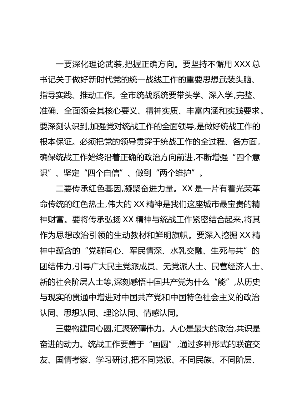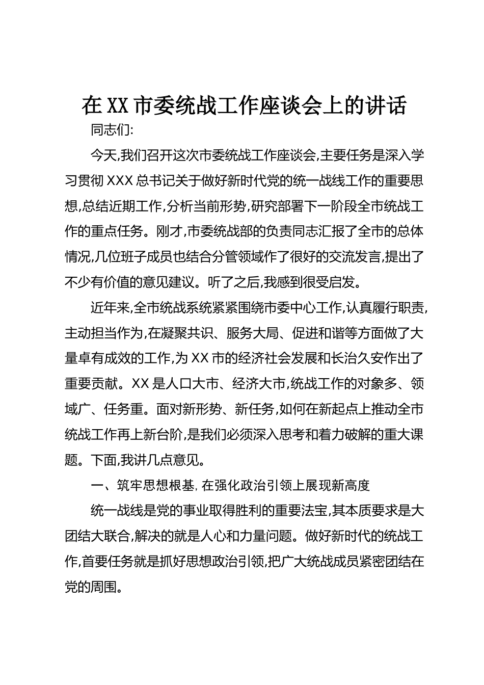 在XX市委統(tǒng)戰(zhàn)工作座談會(huì)上的講話同志們:今天,我們召開這次市委統(tǒng)戰(zhàn)工作座談會(huì),主要任務(wù)是深入學(xué)習(xí)貫徹XXX總書記關(guān)于做好新時(shí)代黨的統(tǒng)一戰(zhàn)線工作的重要思想,總結(jié)近期工作,分析當(dāng)前形勢(shì),研究部署下一階段全市統(tǒng)戰(zhàn)工作的重點(diǎn)任務(wù)。剛才,市委統(tǒng)戰(zhàn)部的負(fù)責(zé)同志匯報(bào)了全市的總體情況,幾位班子成員也結(jié)合分管領(lǐng)域作了很好的交流發(fā)言,提出了不少有價(jià)值的意見建議。聽了之后,我感到很受啟發(fā)。近年來(lái),全市統(tǒng)戰(zhàn)系統(tǒng)緊緊圍繞市委中心工作,認(rèn)真履行職責(zé),主動(dòng)擔(dān)當(dāng)作為,在凝聚共識(shí)、服務(wù)大局、促進(jìn)和諧等方面做了大量卓有成效的工作,為XX市的經(jīng)濟(jì)社會(huì)發(fā)展和長(zhǎng)治久安作出了重要貢獻(xiàn)。XX是...