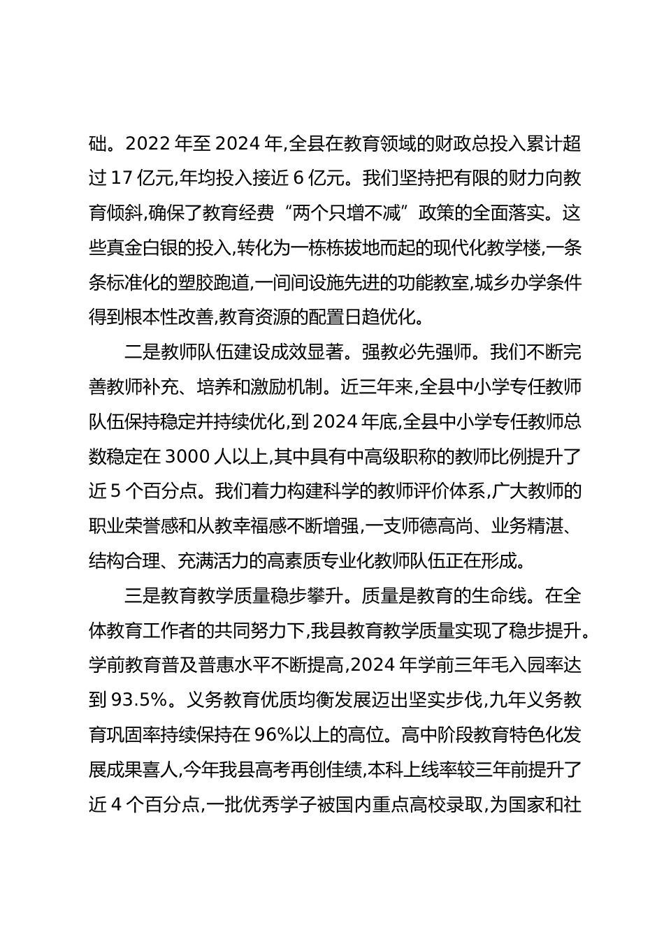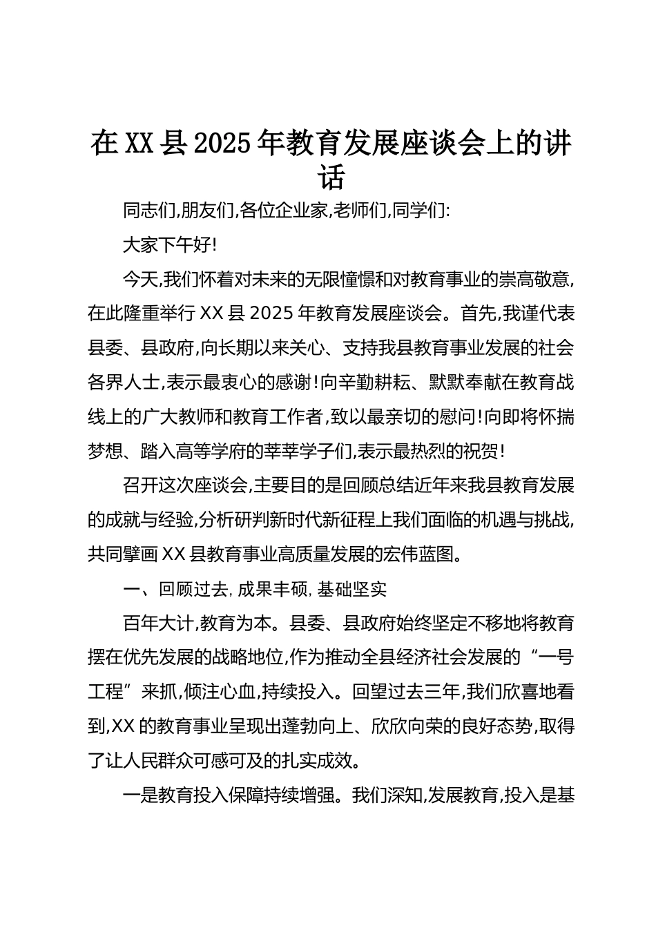 在XX縣2025年教育發(fā)展座談會上的講話同志們,朋友們,各位企業(yè)家,老師們,同學(xué)們:大家下午好!今天,我們懷著對未來的無限憧憬和對教育事業(yè)的崇高敬意,在此隆重舉行XX縣2025年教育發(fā)展座談會。首先,我謹(jǐn)代表縣委、縣政府,向長期以來關(guān)心、支持我縣教育事業(yè)發(fā)展的社會各界人士,表示最衷心的感謝!向辛勤耕耘、默默奉獻(xiàn)在教育戰(zhàn)線上的廣大教師和教育工作者,致以最親切的慰問!向即將懷揣夢想、踏入高等學(xué)府的莘莘學(xué)子們,表示最熱烈的祝賀!召開這次座談會,主要目的是回顧總結(jié)近年來我縣教育發(fā)展的成就與經(jīng)驗(yàn),分析研判新時代新征程上我們面臨的機(jī)遇與挑戰(zhàn),共同擘畫XX縣教育事業(yè)高質(zhì)...